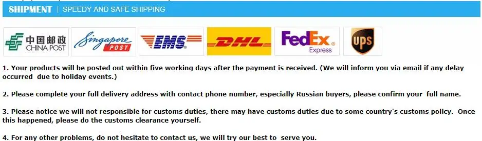Packages from our warehouse in China will be shipped by ePacket or EMS depending on the weight and size of the product. Packages shipped from our US warehouse are shipped through USPS.