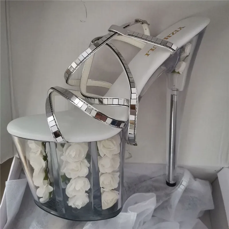 20 cm Roman silver vamp sandals, 8 inch heels, sexy club white rose crystal sandals, summer party wedding shoes