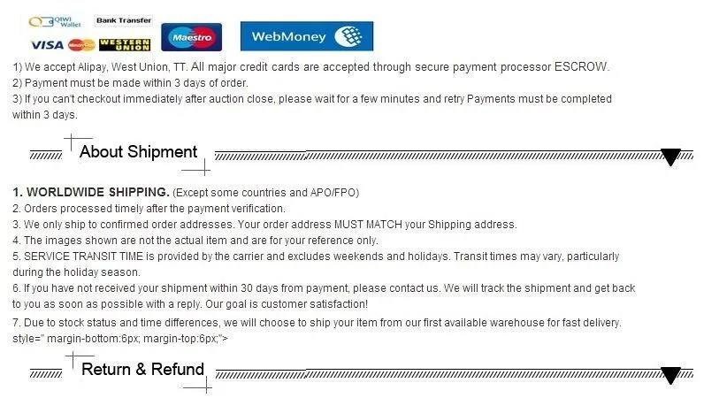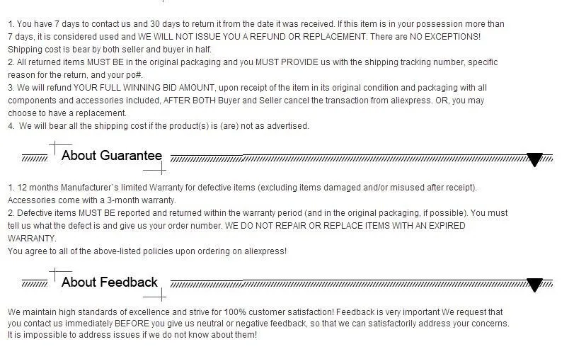 • If you did not receive the product within the guaranteed time( 45 days not including 2-5 day processing) you can request a refund or a reshipment.