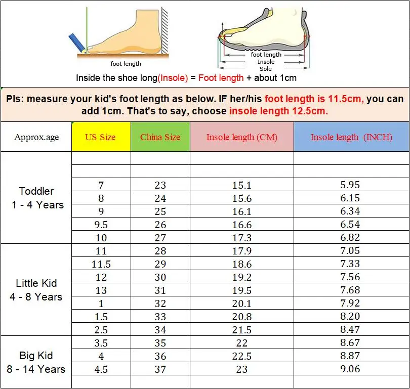 5. With regard to size, measure kids foot length cm or inch +1 cm or 0.03937 inch, select the corresponding us size, thanks