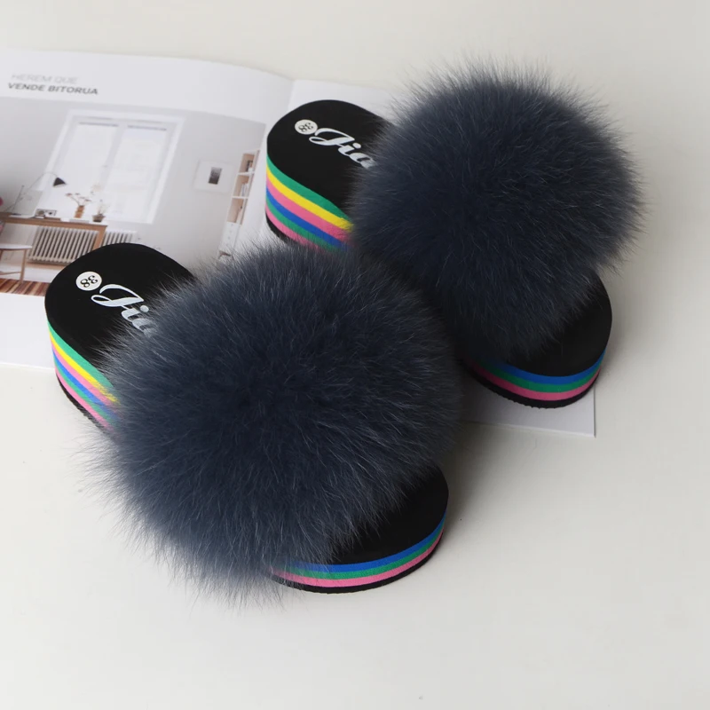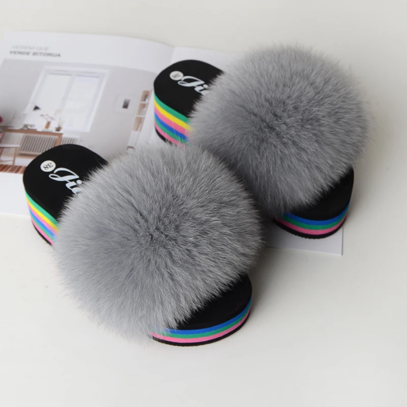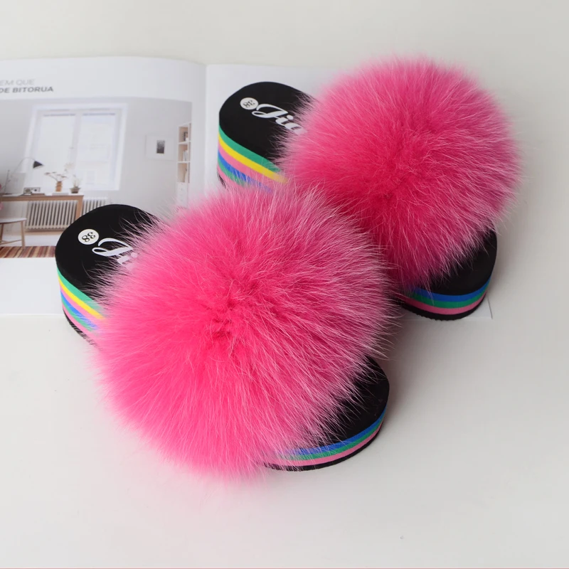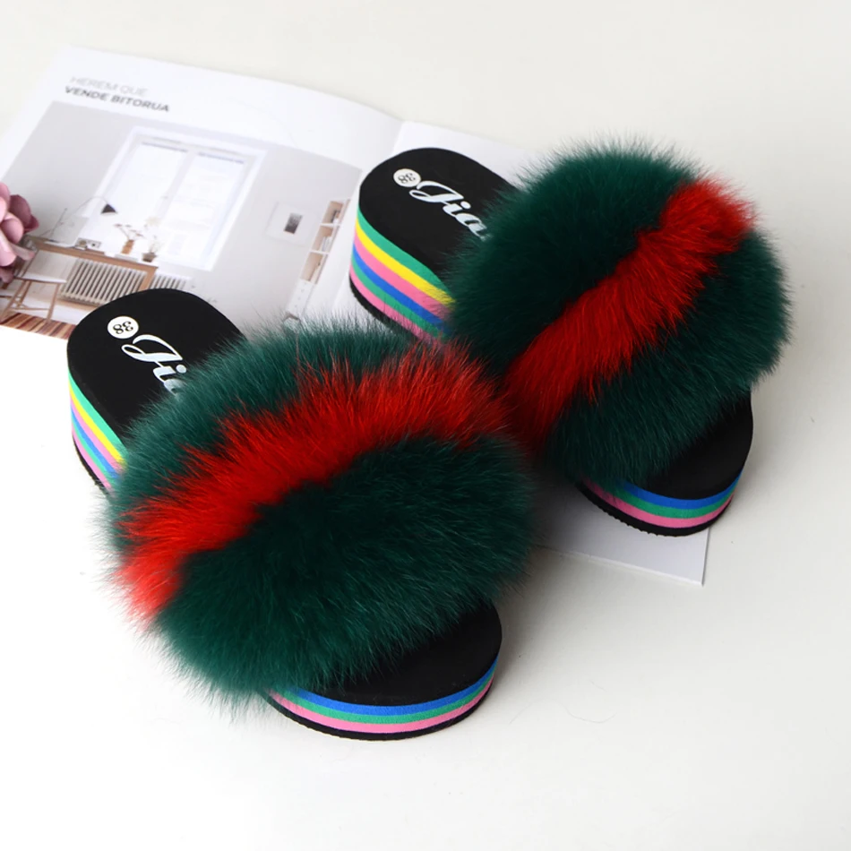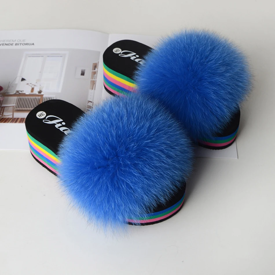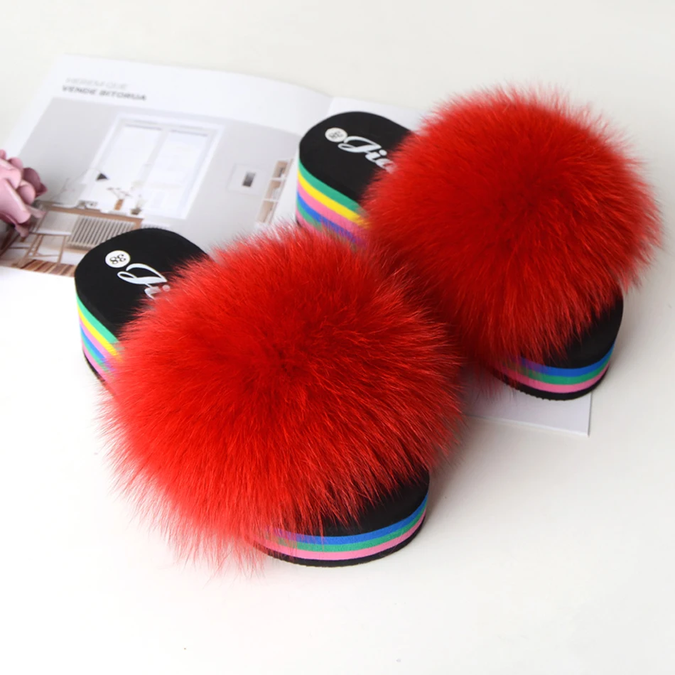 Fur Slippers Women Real Fox Fur Slides Home Furry high heel Sandals Female Cute Fluffy House Shoes Woman Brand Luxury