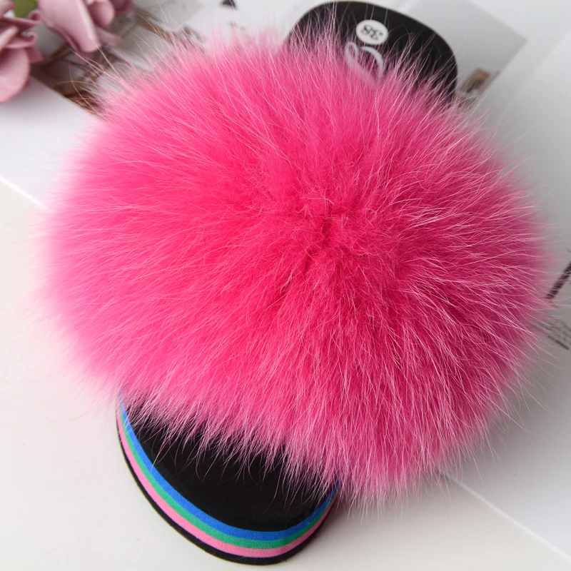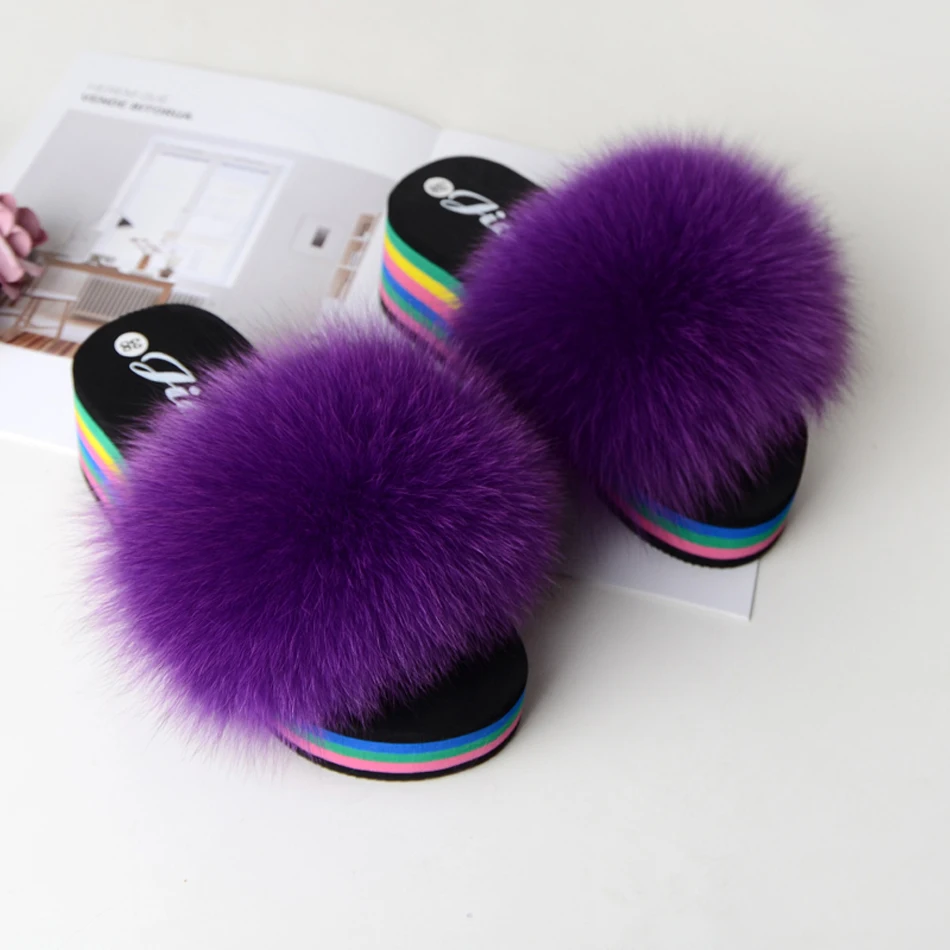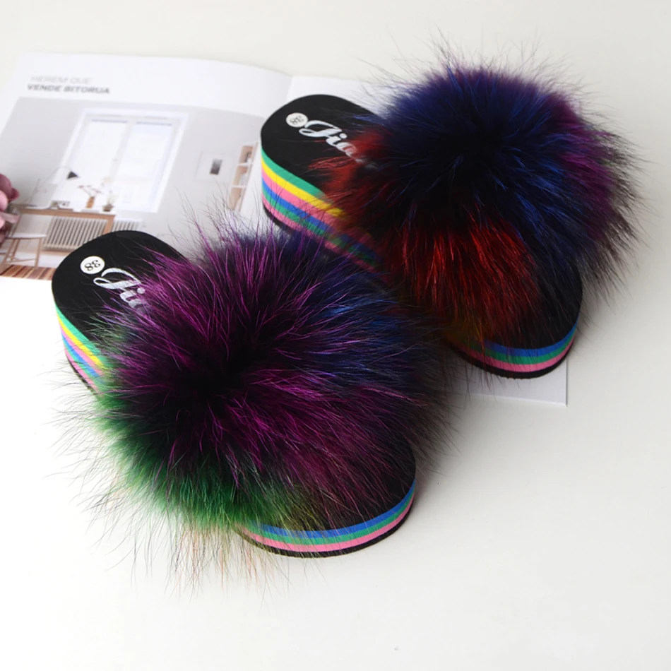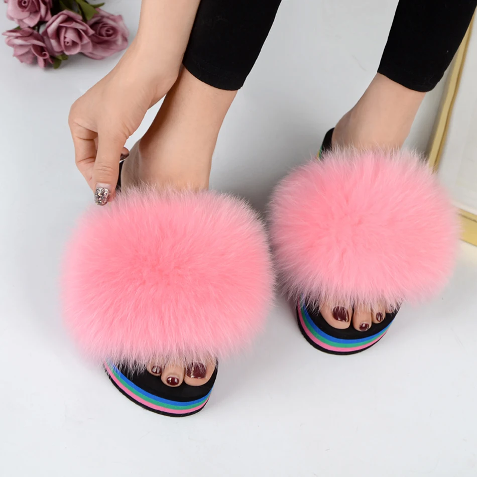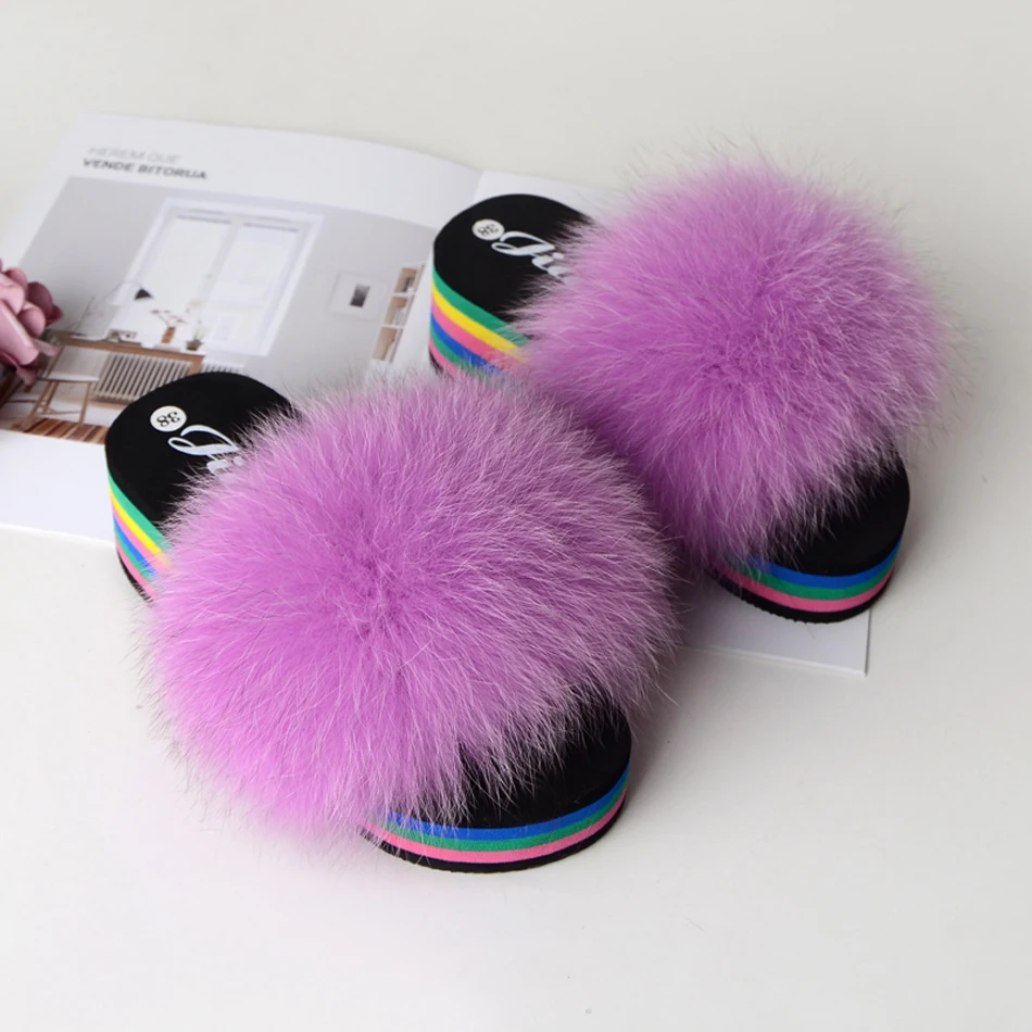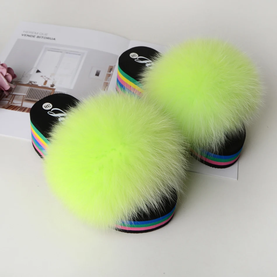Fur Slippers Women Real Fox Fur Slides Home Furry high heel Sandals Female Cute Fluffy House Shoes Woman Brand Luxury