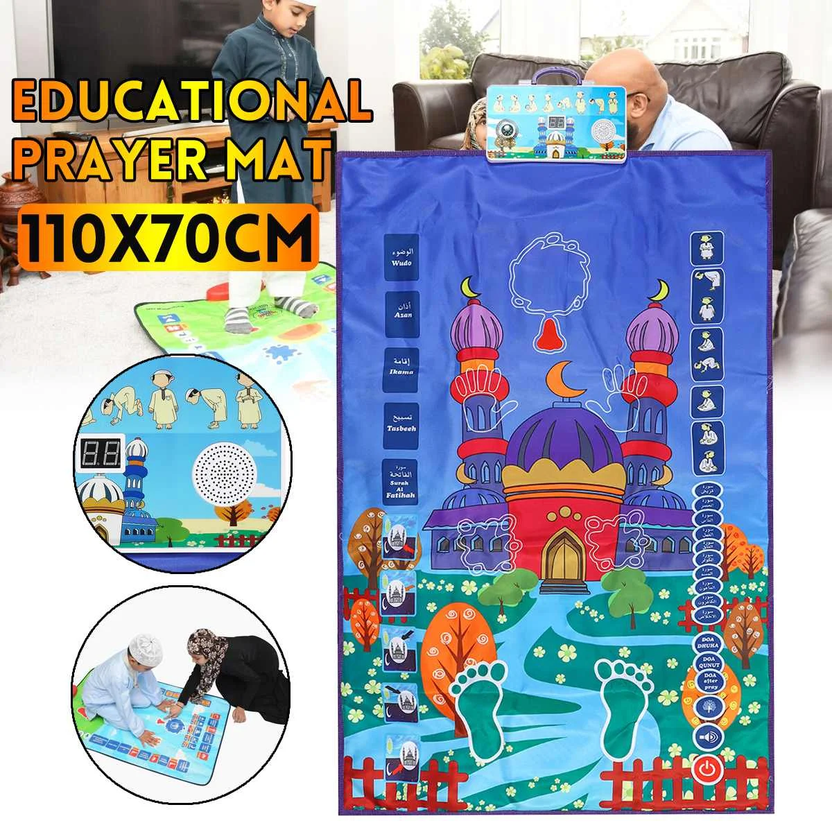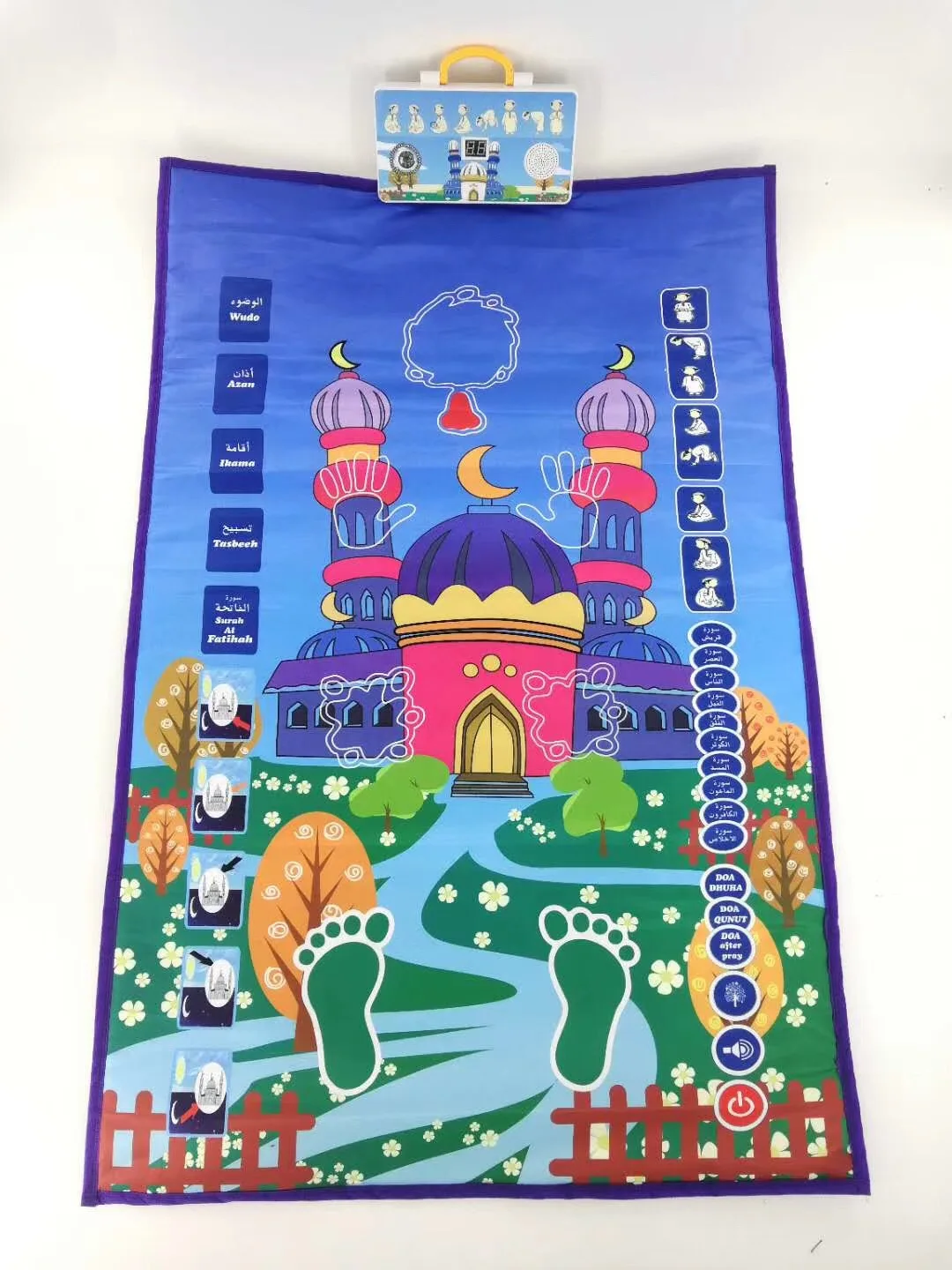 this is a prayer mat designed to educate children on how to perform the Muslim prayer in a fun and enjoyable way. The interactive prayer mat is touch sensitive and has pre-recorded keys that can be touched to reveal the sound, such as prayer times, how to do wudu, recite surahs, say duas, and much more. It can teach about the different times of salah, and the various bodily movements and positions, and what to say during them. In order to make the learning process easy, My Salah Mat will guide the user through two rakat of salah using a simple to understand format.