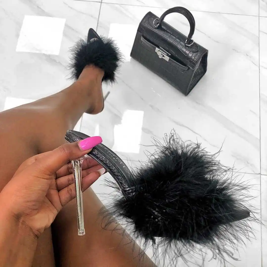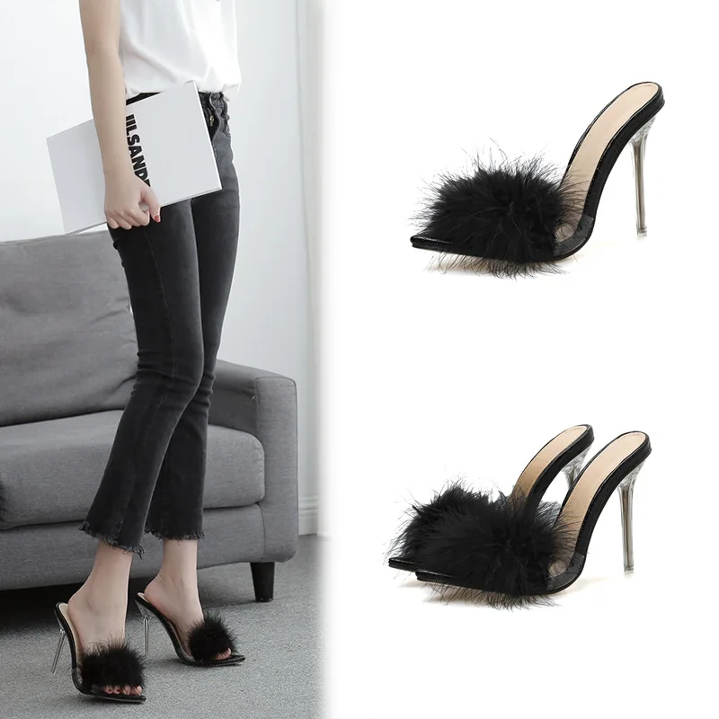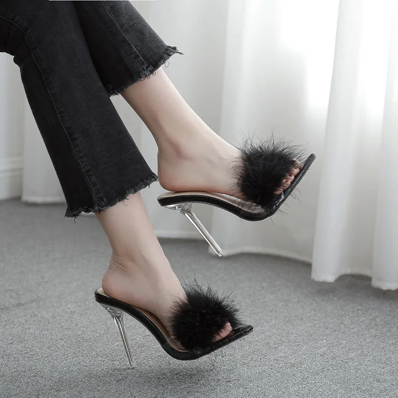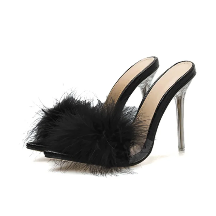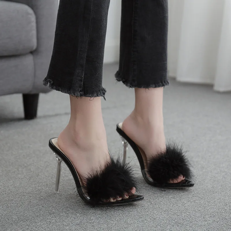 2020 New Transparent Crystal High heels Woman Feather Fur Slippers Pumps Women Peep toe Mules Lady Slippers Slides Black