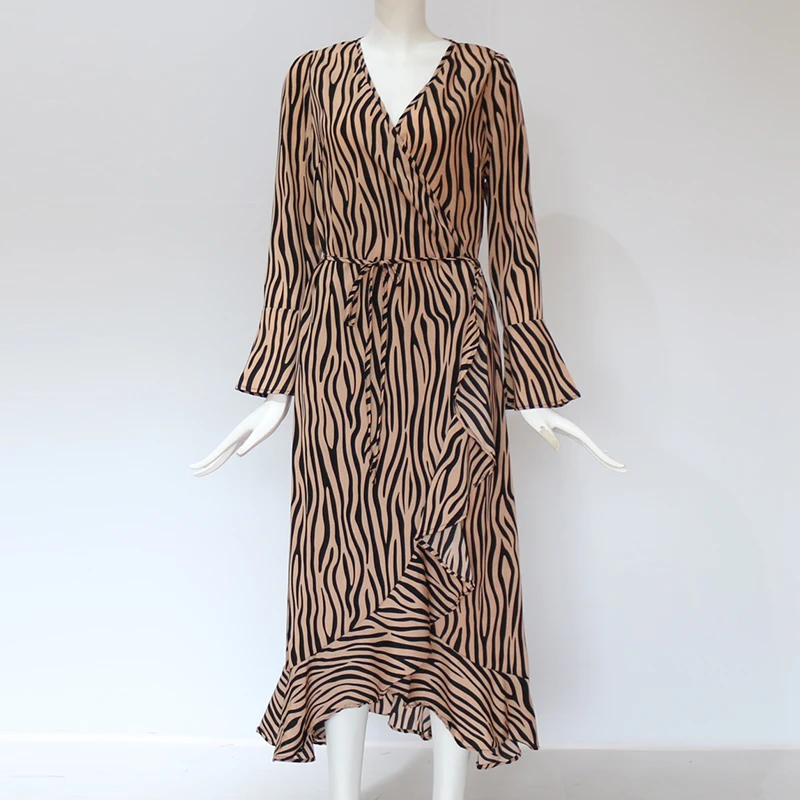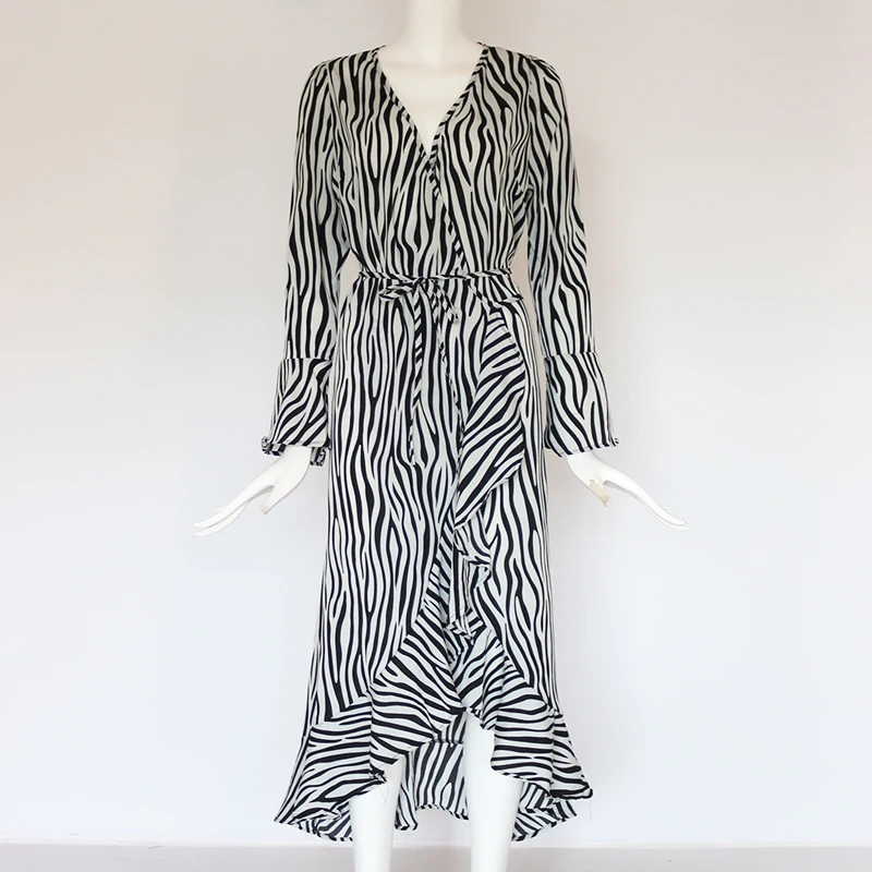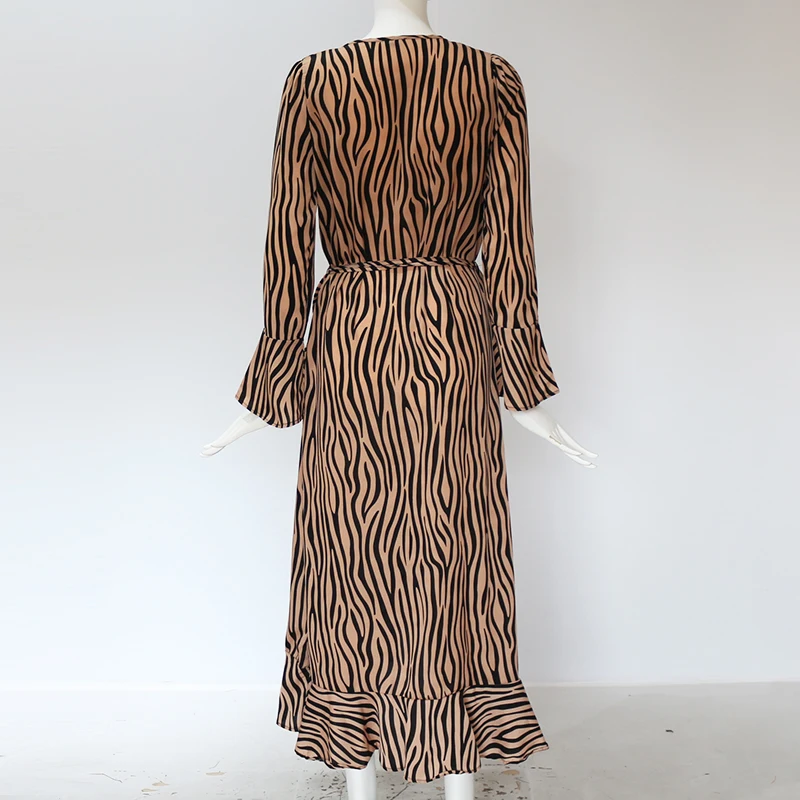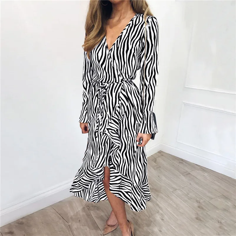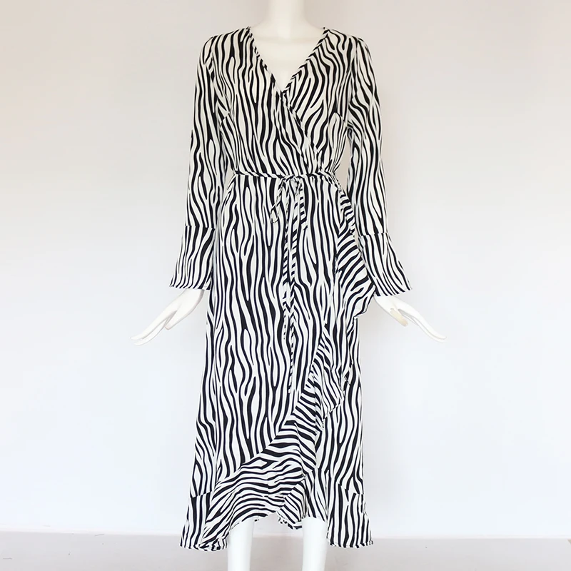 Long Dresses 2019 Women Zebra Print Beach Maxi Dress Casual Long Sleeve V Neck Ruffles Elegant Party Dress Vestidos