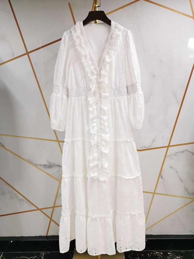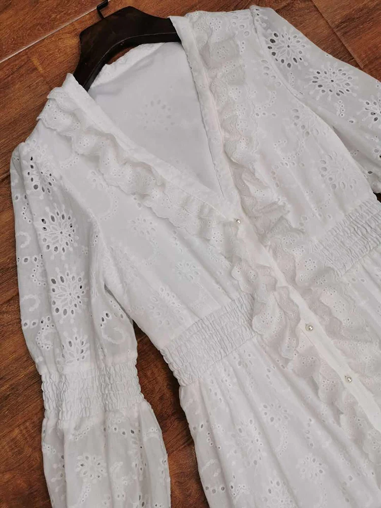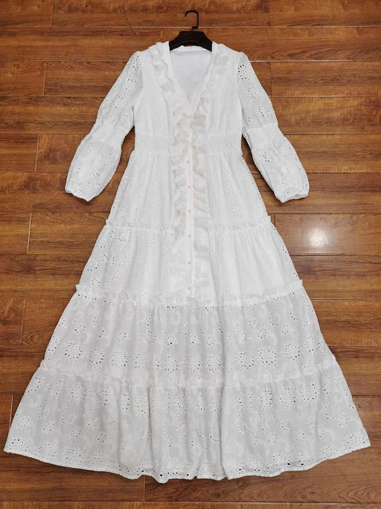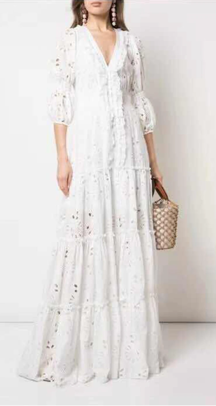 AELESEEN Maxi White Dress Women 2020 Spring Summer 3/4 Sleeve Ruffles Flower Embroidery V-Neck Party Holiday Dress Vestidos