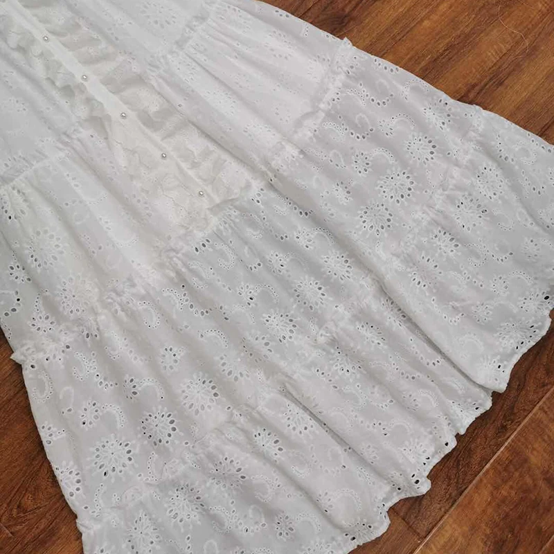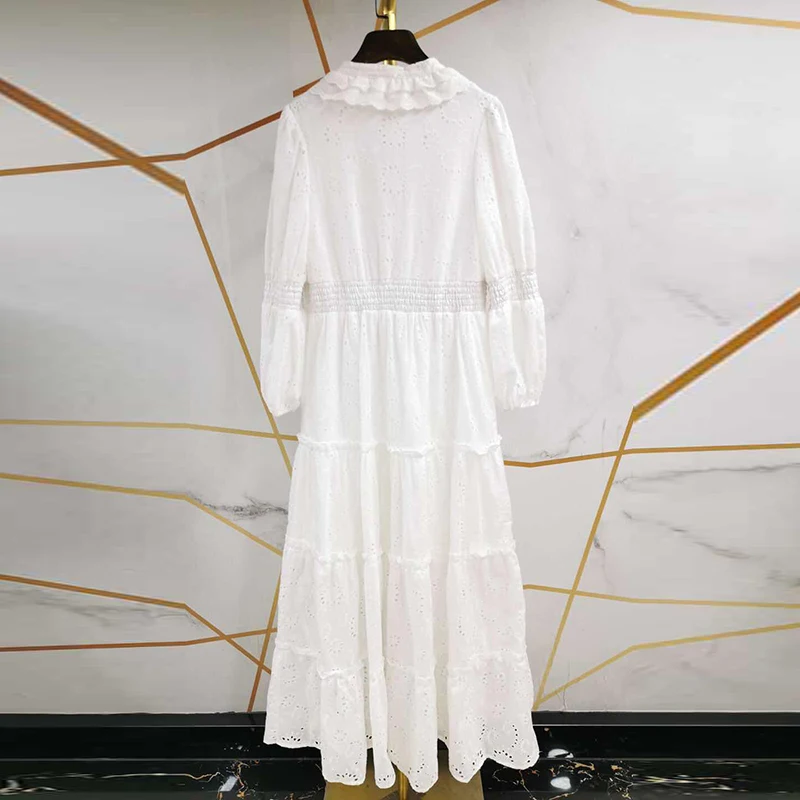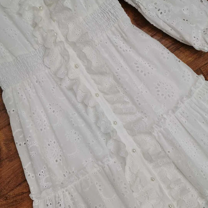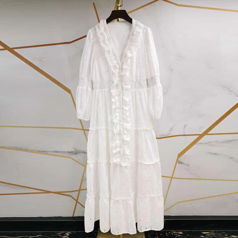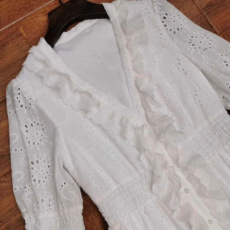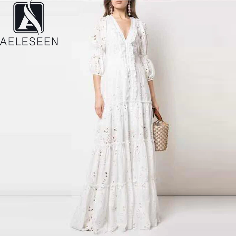 AELESEEN Maxi White Dress Women 2020 Spring Summer 3/4 Sleeve Ruffles Flower Embroidery V-Neck Party Holiday Dress Vestidos