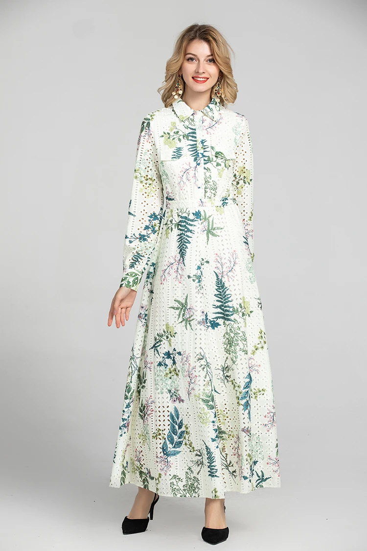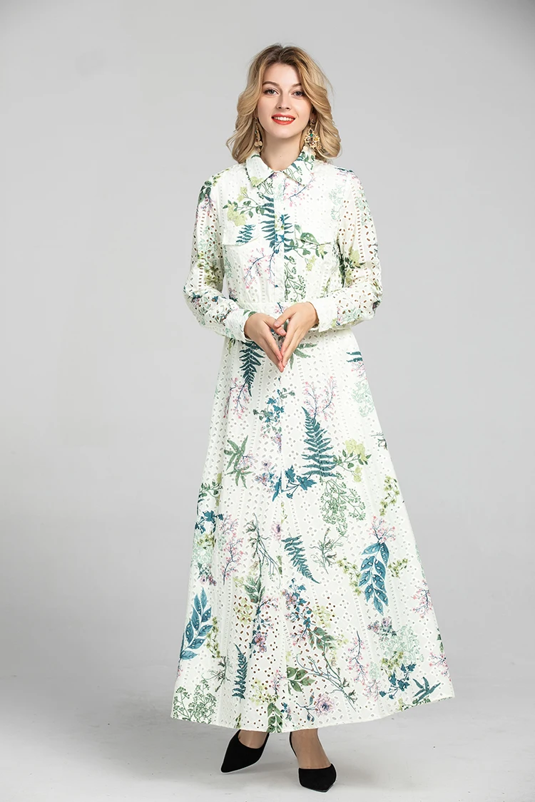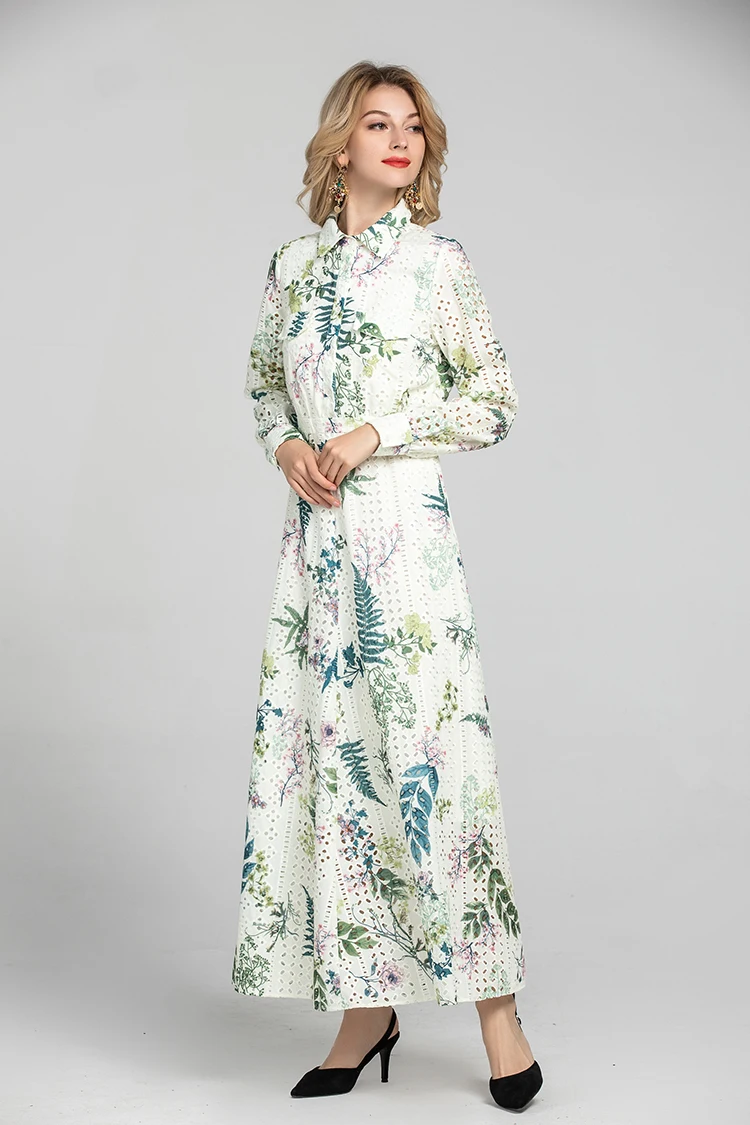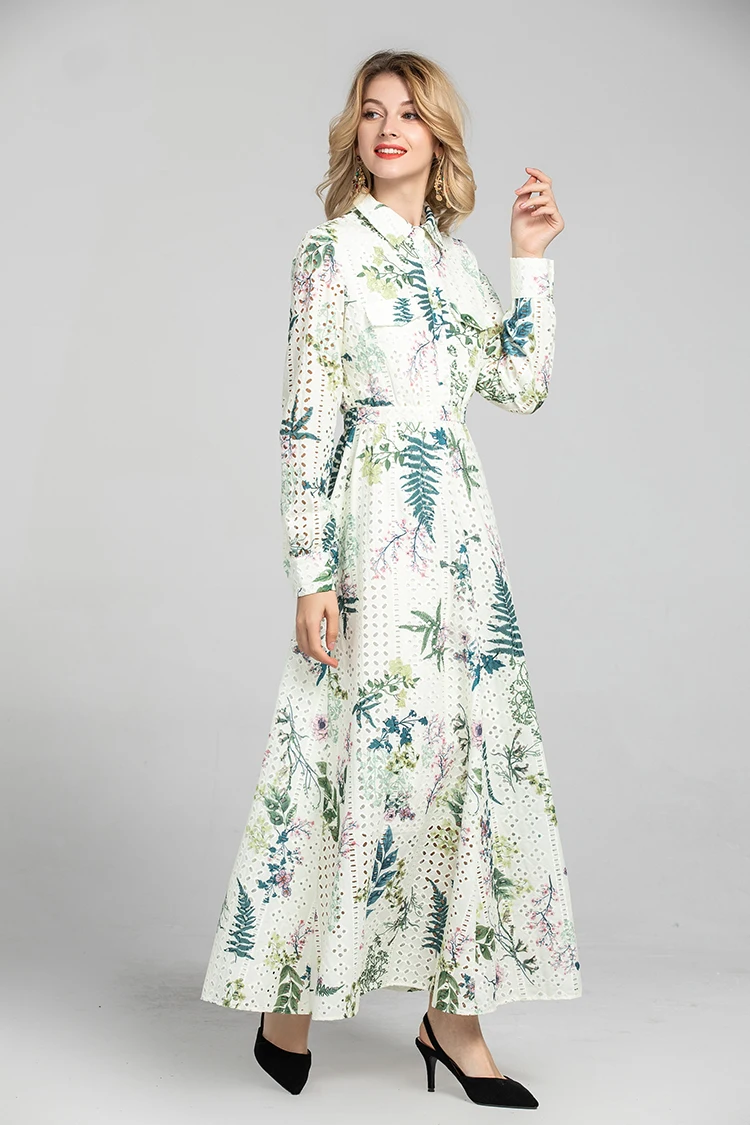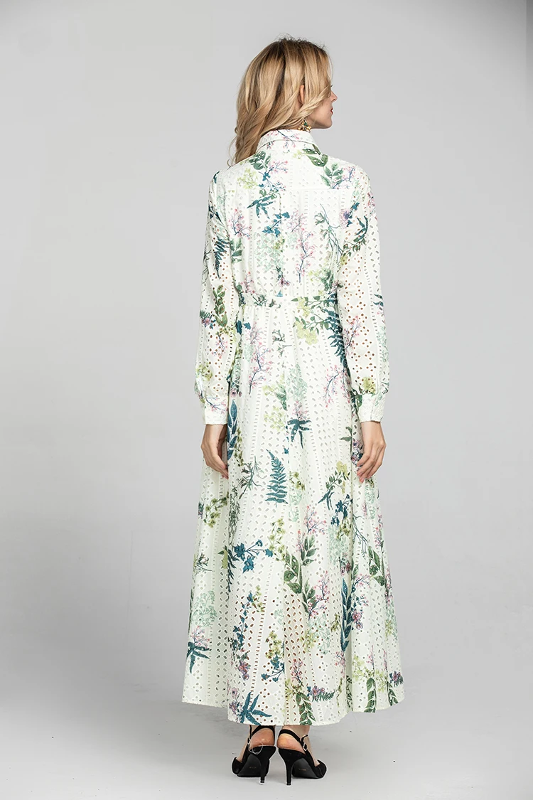 AELESEEN Runway Fashion Shirt Dress 2020 Spring Summer Designer Floral Print Hollow Out Elegant Holiday Party Maxi Dress