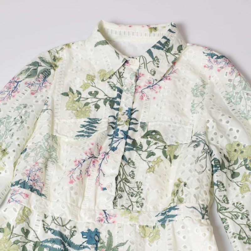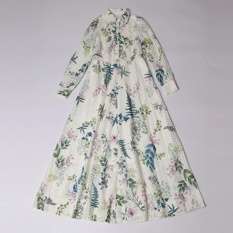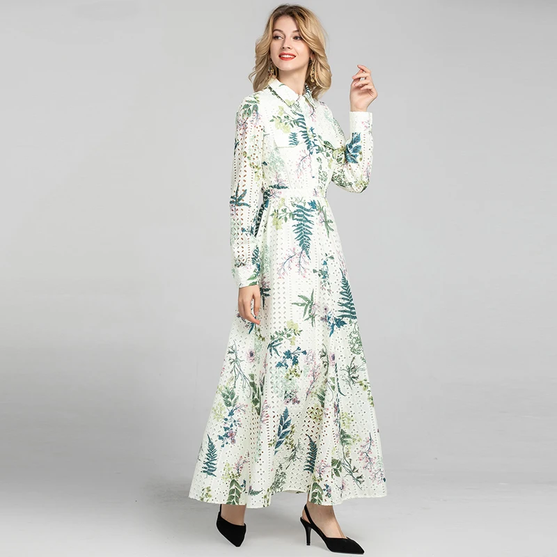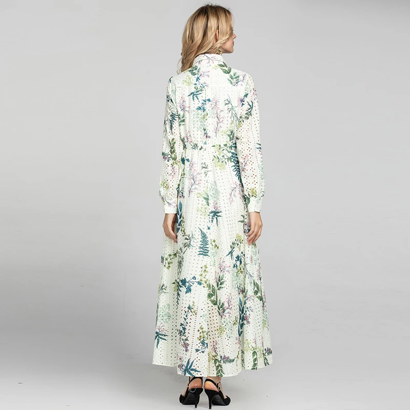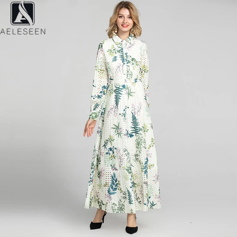 AELESEEN Runway Fashion Shirt Dress 2020 Spring Summer Designer Floral Print Hollow Out Elegant Holiday Party Maxi Dress