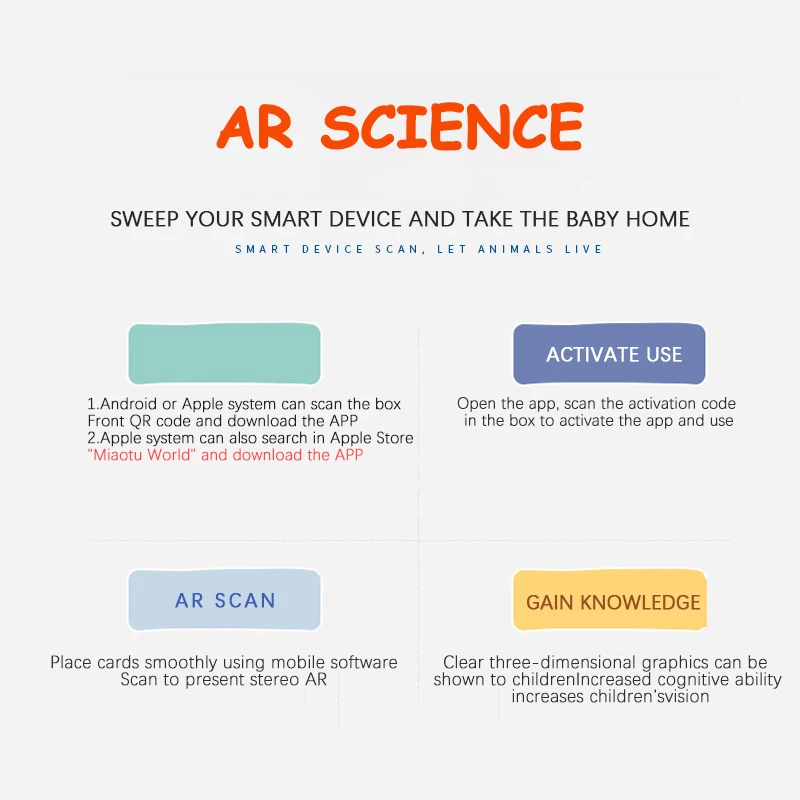 ——The perfect combination of AR technology and animals, with sound and interaction, enables children to better understand them;