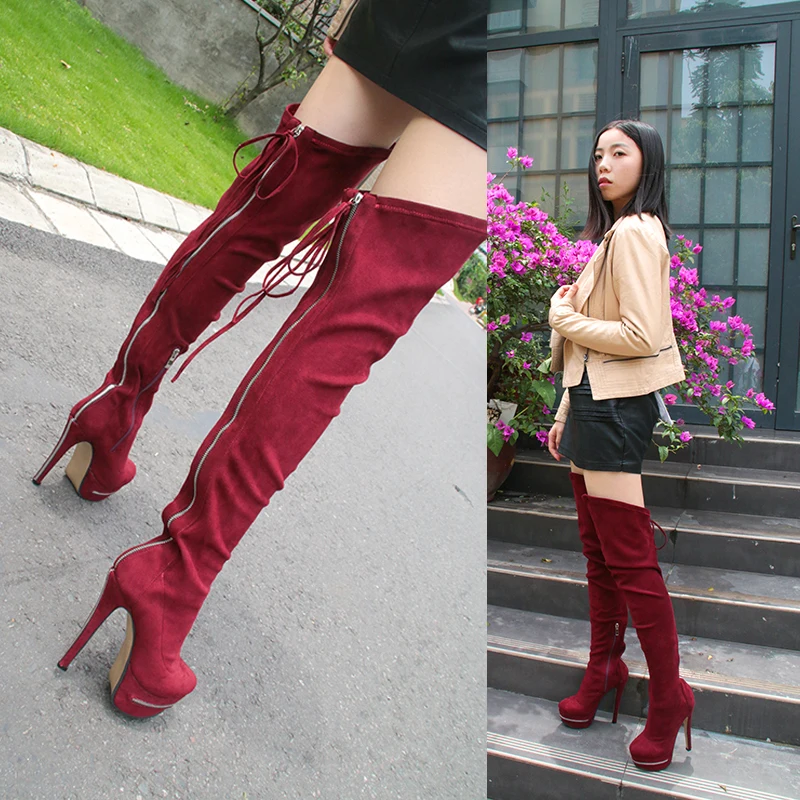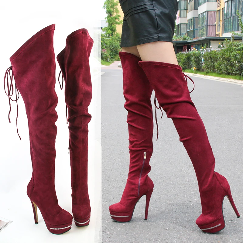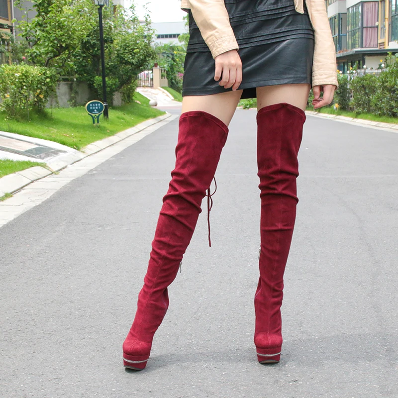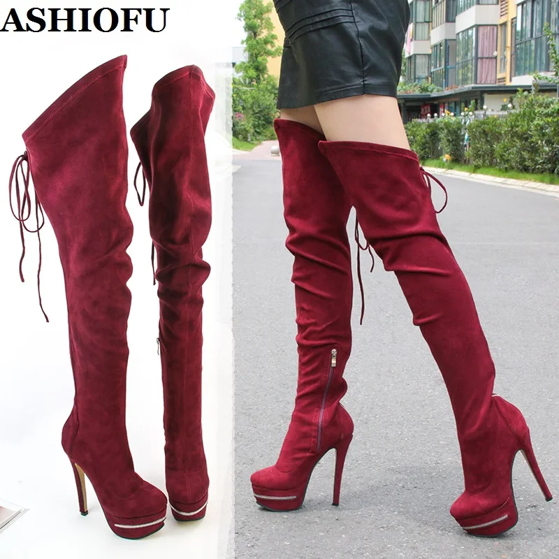 ASHIOFU Ladies Thigh High Boots Shoelace Party Over Knee Boots Platform Evening Boots