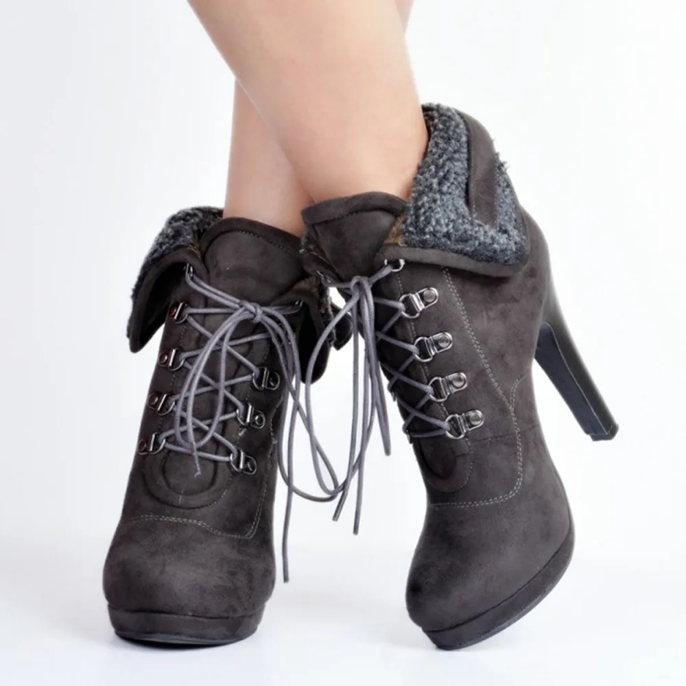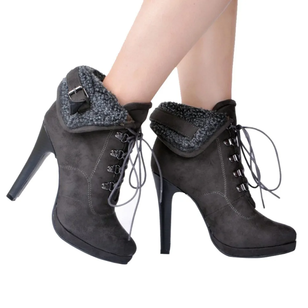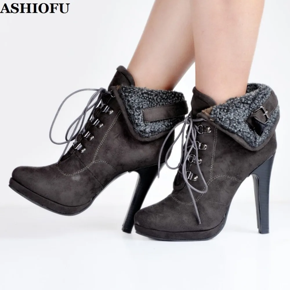 ASHIOFU Handmade Women’s Stiletto High Heel Boots Turnover Lace-up Party Winter Ankle Boots Evening Warm Fashion Short Boots