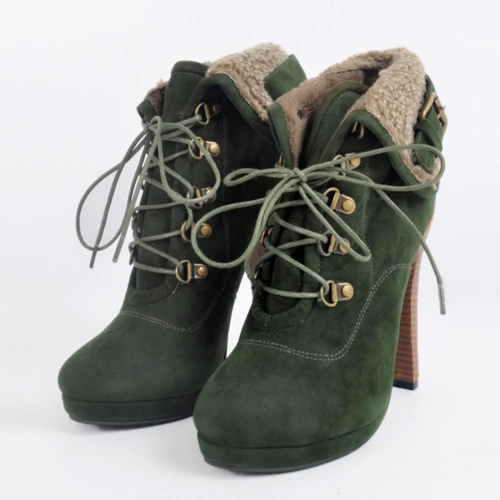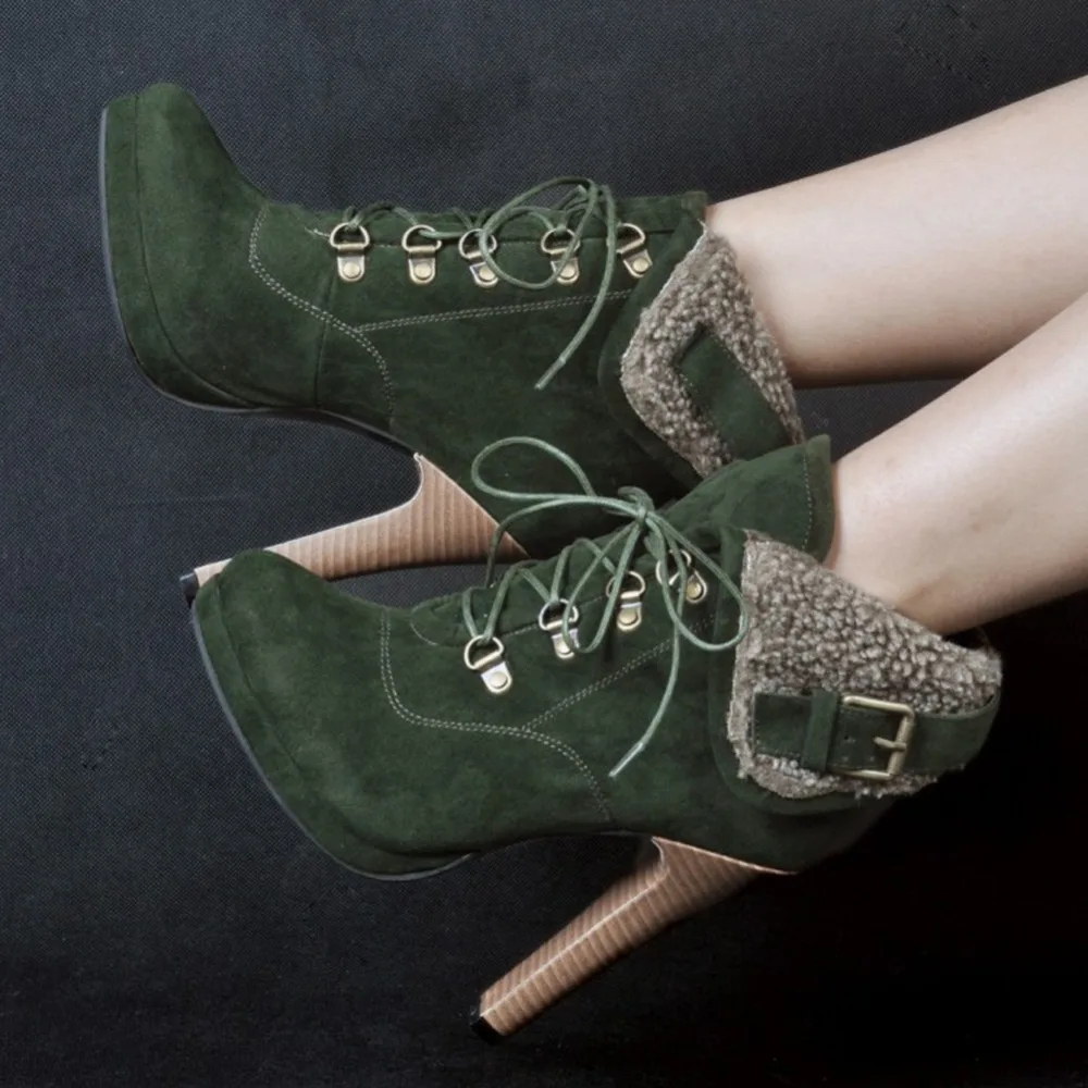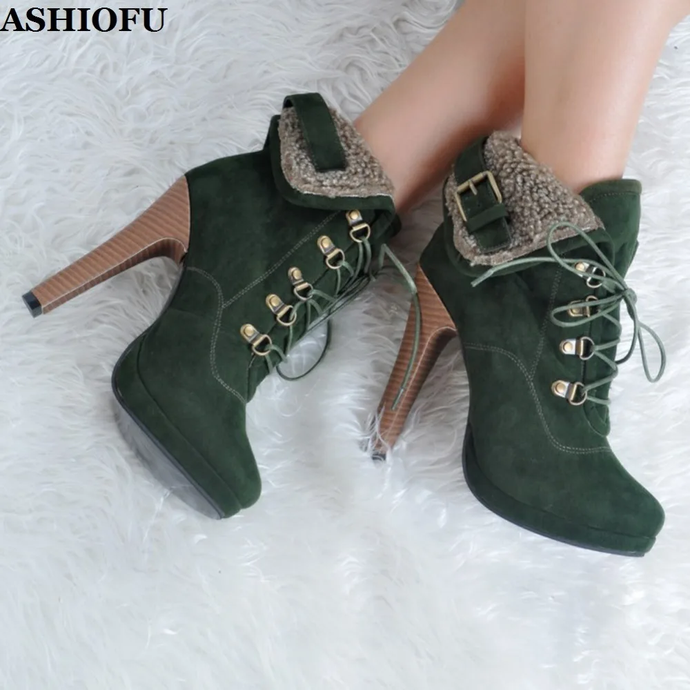 ASHIOFU Vintage Handmade Ladies High Heel Boots Short-plush Turn-over Winter Ankle Boots Lace-up Platform Evening Warm Boots