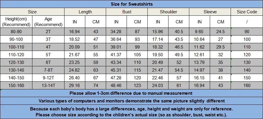 3. Because each baby’s body has a large differences, age, height and weight are only for reference. Please choose size according to the children’s actual size (so as shoulder, bust, waist etc.).