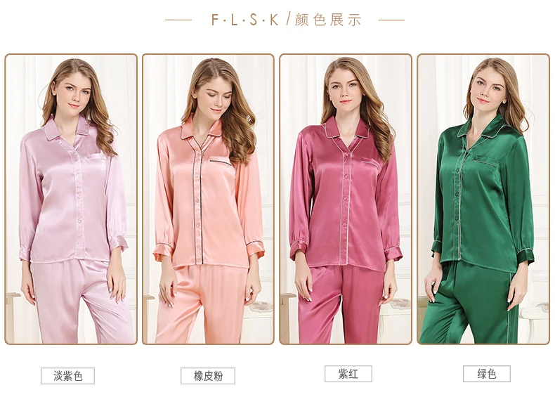 Autumn Women100% Silk Satin Pajama Sets Solid color Long Sleeve Sleepwear Set Two-pieces Big Size L-2XL Pyjamas 4 colors