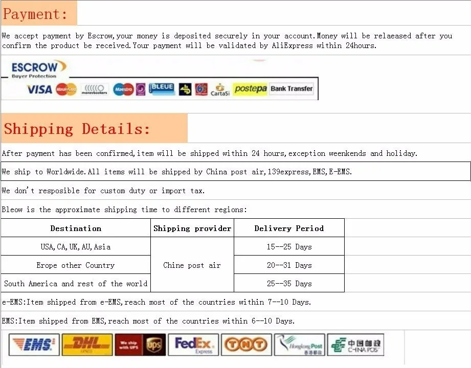 Packages from our warehouse in China will be shipped by ePacket or EMS depending on the weight and size of the product. Packages shipped from our US warehouse are shipped through USPS.