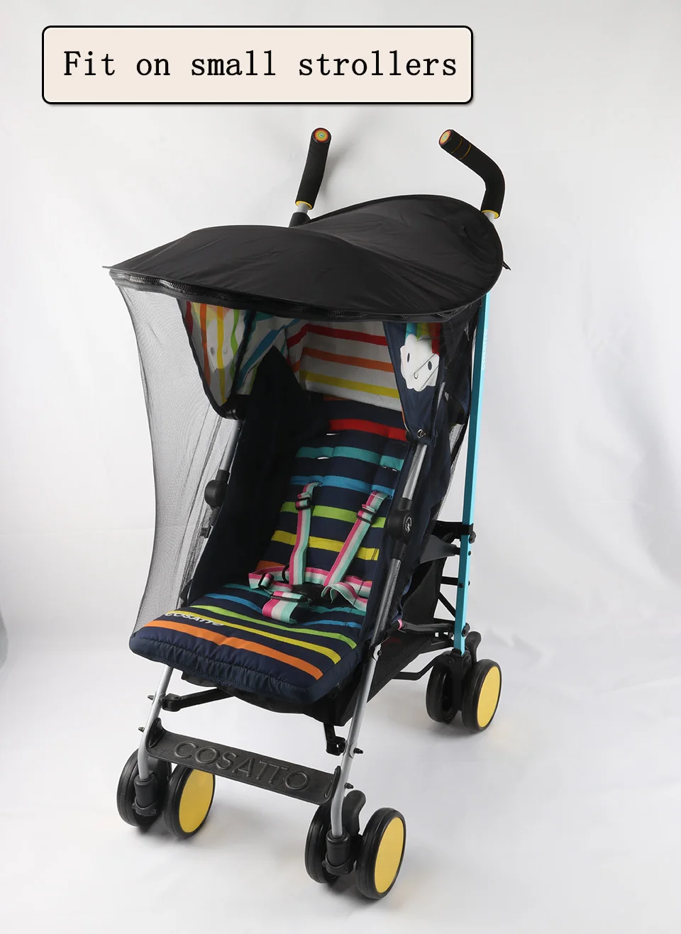 1. Multifunctional, 3 in 1 Mosquito net+ sunshade + raincover 2. Universal it’s suitabele for nearly all strollers. 3. Easy to assembly and remove.