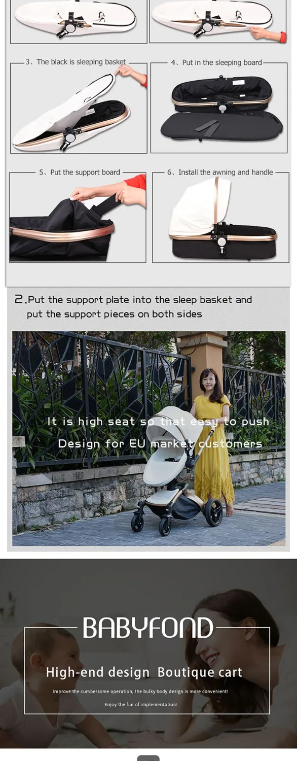 Product detail: Age of application : 0-36 month baby Material: eco-friend high quality pu leather Frame material: aluminium alloy Funcation: 360 degree rotate , 3 in 1 funcation. CE safety tests * 3 in 1 price including : baby stroller + baby bassinet + car seat + free gifts. 2 in 1 SKU including: baby stroller + baby bassinet + free gifts. Free gift : mattress, leg cover , hooks and mosquito net ,cup holder .