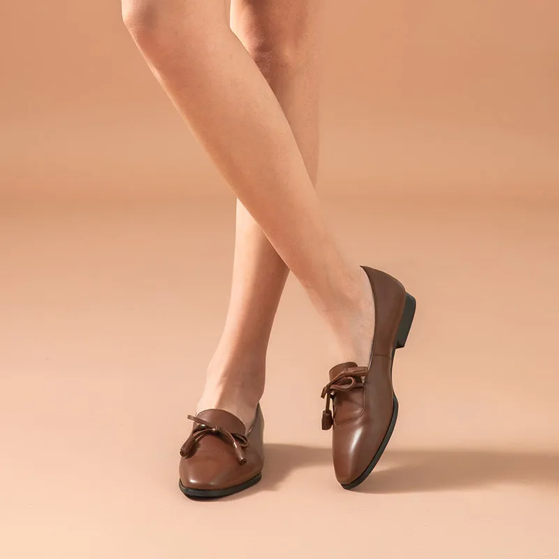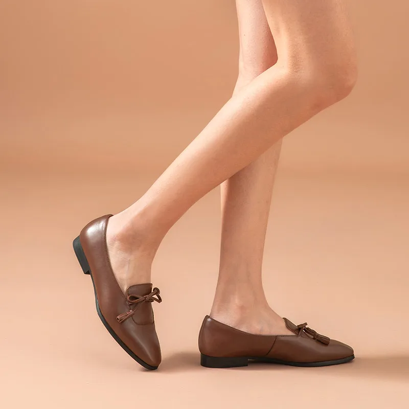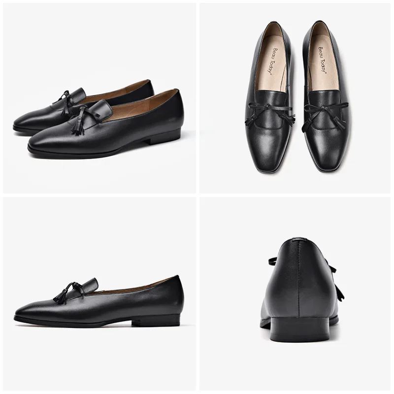 BeauToday Fringes Loafers Women Calfskin Genuine Leather Butterfly-Knot Square Toe Ladies Slip On Flats Handmade 27084