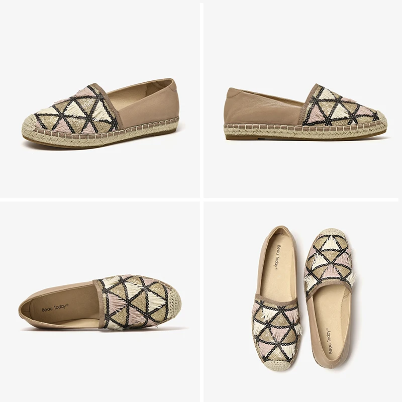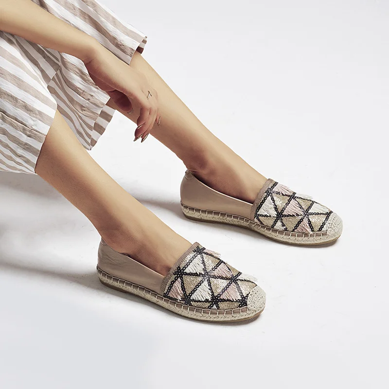BeauToday Sequins Tassel Loafers Women Genuine Leather Sheepskin Mesh Mixed Colors Round Toe Lady Flats Handmade 24035