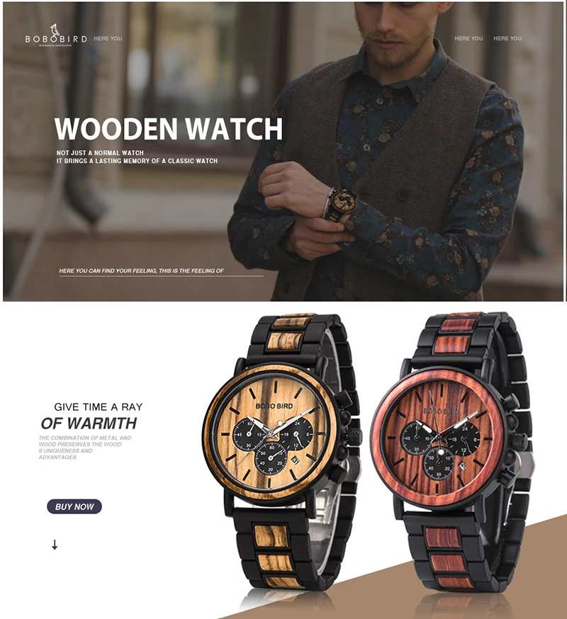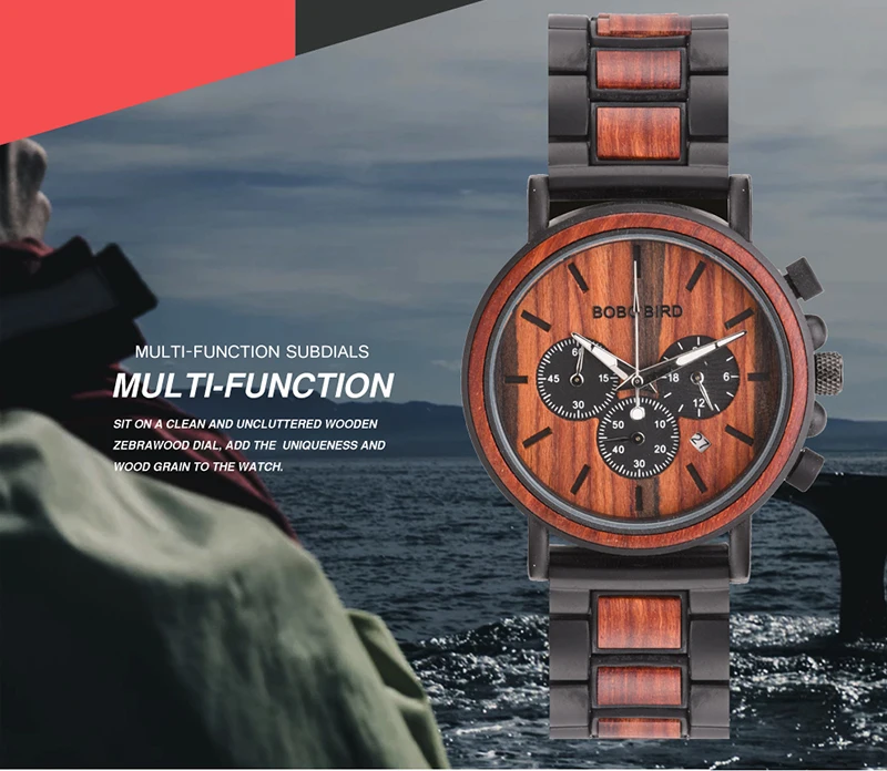 This men chronograph wood watch is equipped with high quality quartz movement . Diameter of the dial is 45mm. The case is carefully crafted from 100% wood and metal framed.