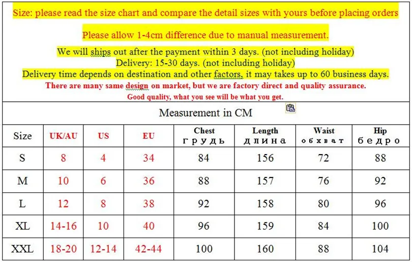 Size: please read the size chart and compare the detail sizes with yours before placing orders Please allow 1-4cm difference due to manual measurement. We will ships out after the payment within 3 days. (not including holiday) Delivery: 15-30 days. (not including holiday) Delivery time depends on destination and other factors, it may takes up to 60 business days. There are many same design on market, but we are factory direct and quality assurance. Good quality, what you see will be what you get. |