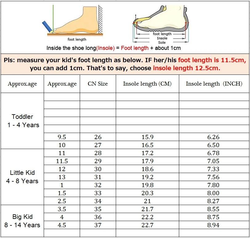 5. With regard to size, measure kids foot length cm or inch +1 cm or 0.03937 inch, select the corresponding us size, thanks