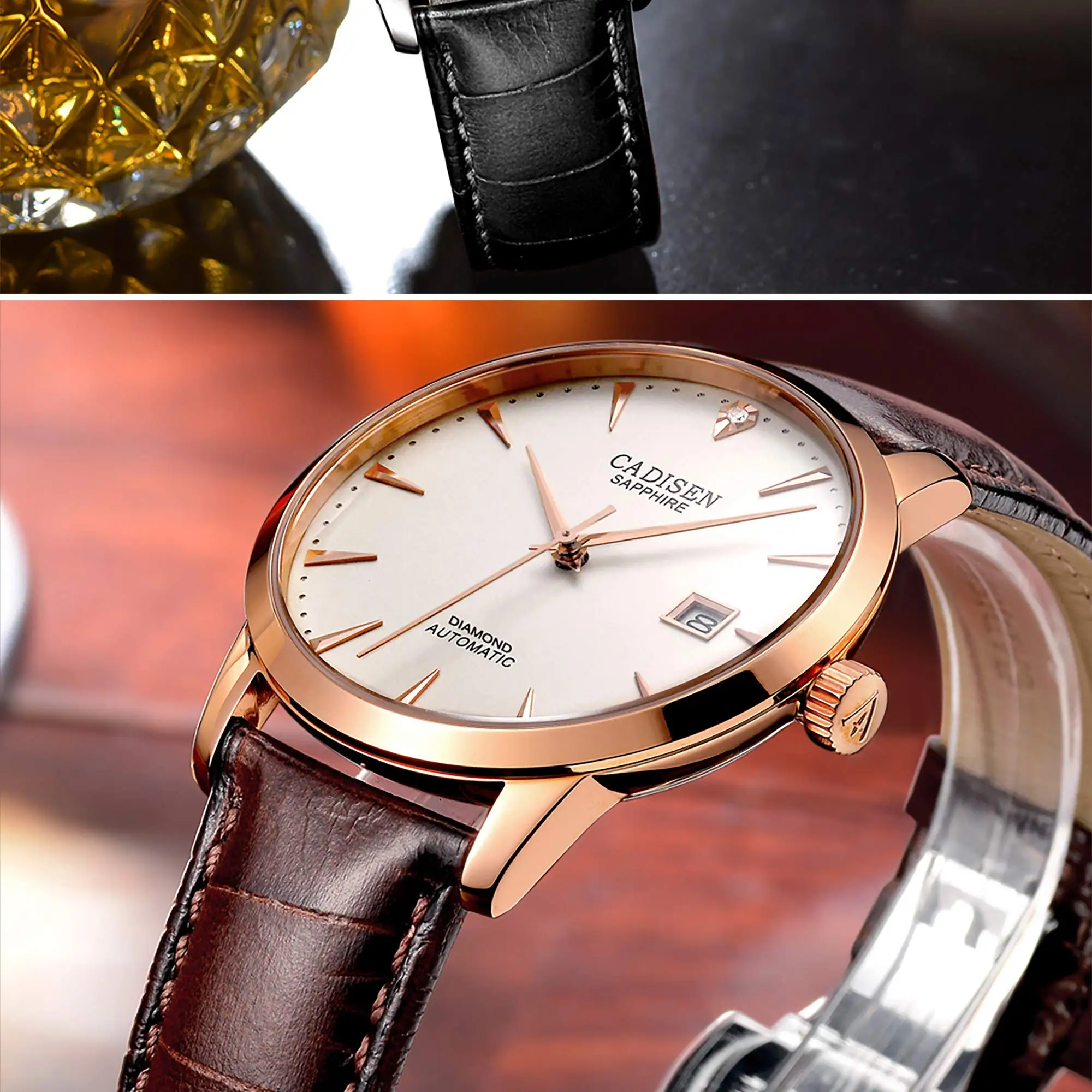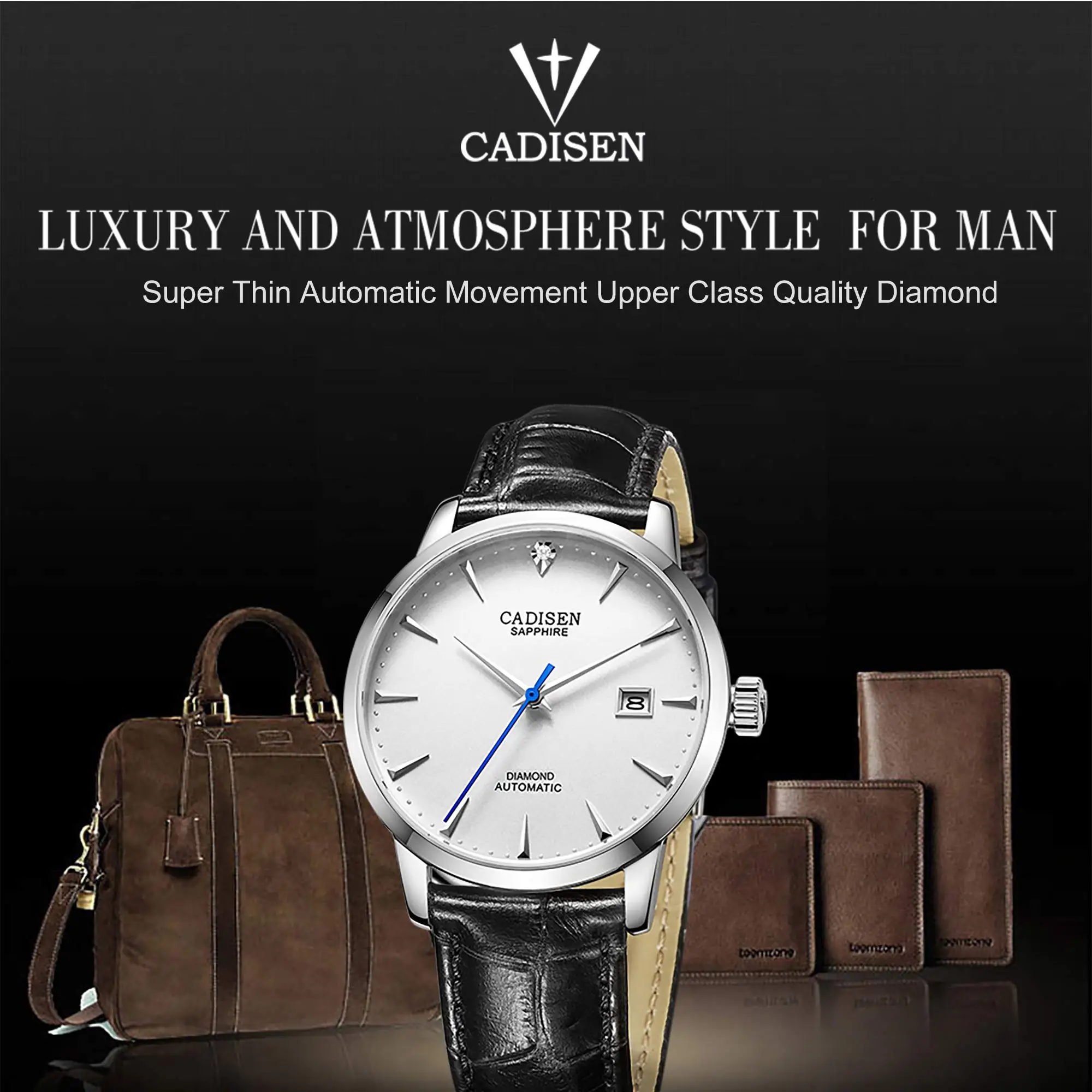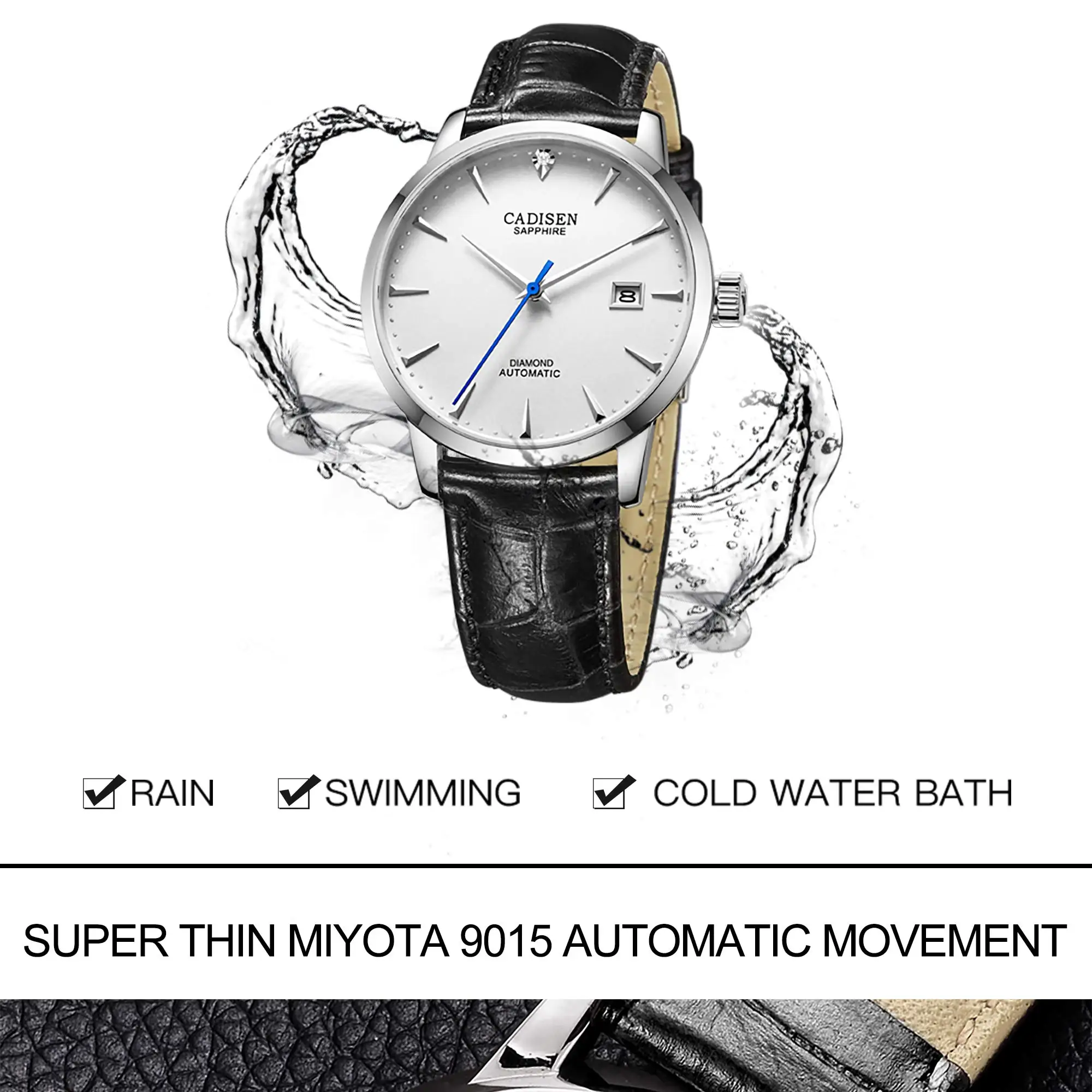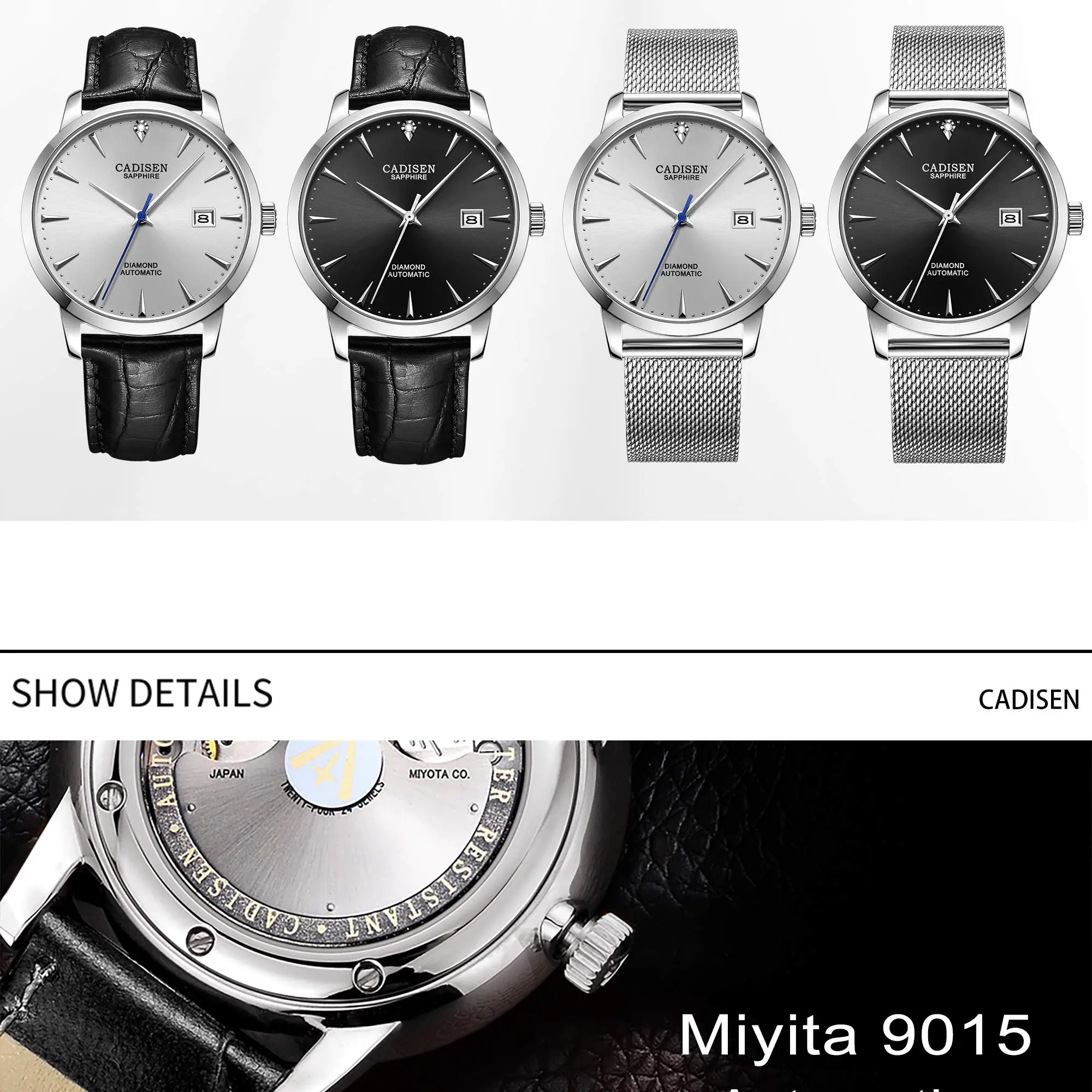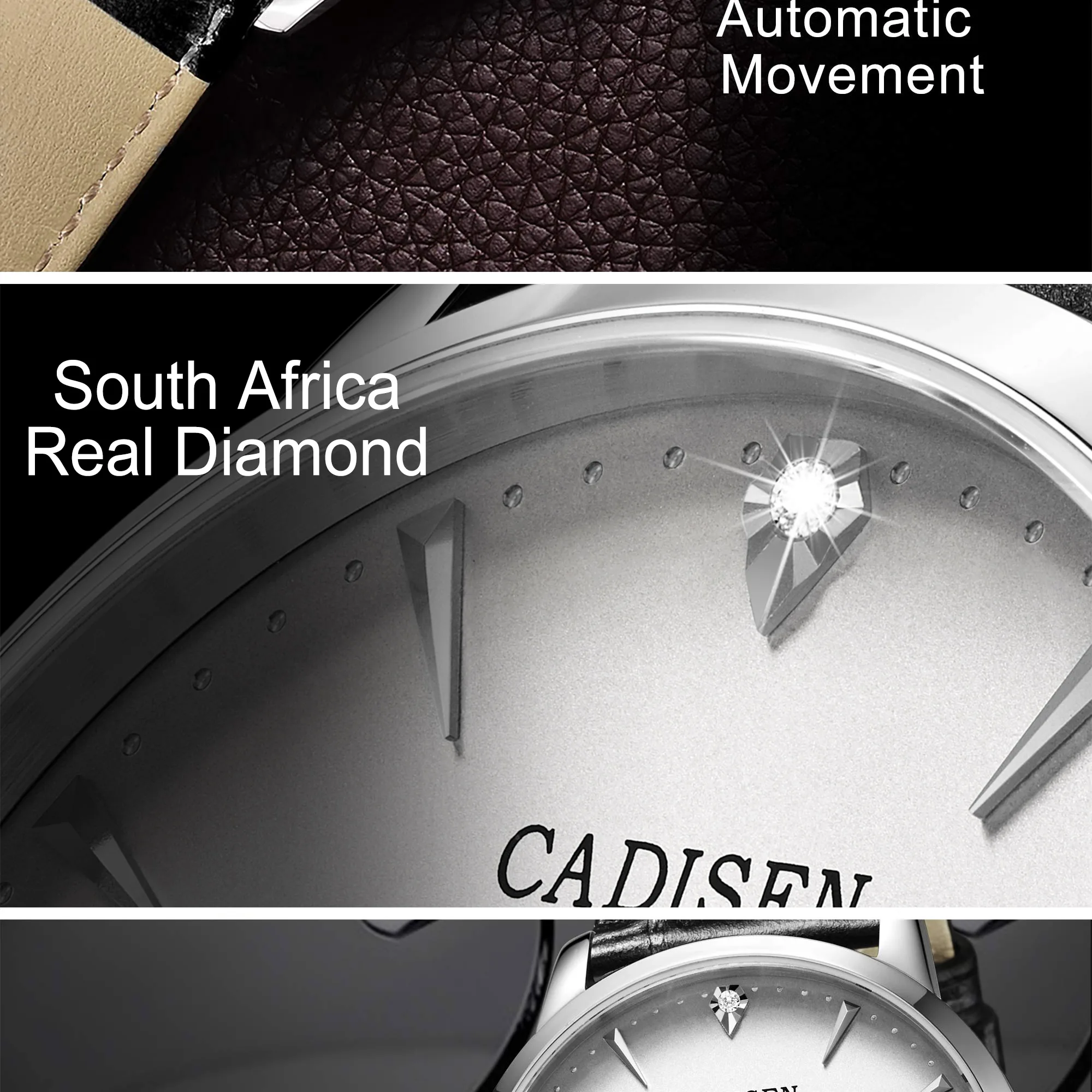 CADISEN Men Watches Automatic Mechanical Wrist Watch Japen MIYOTA 9015 Movement Hot Brand Luxury South Africa Real Diamonds Watch Stainless steel Watch Curved Sapphire Glass Genuine Leather Strap Famous Male Clock