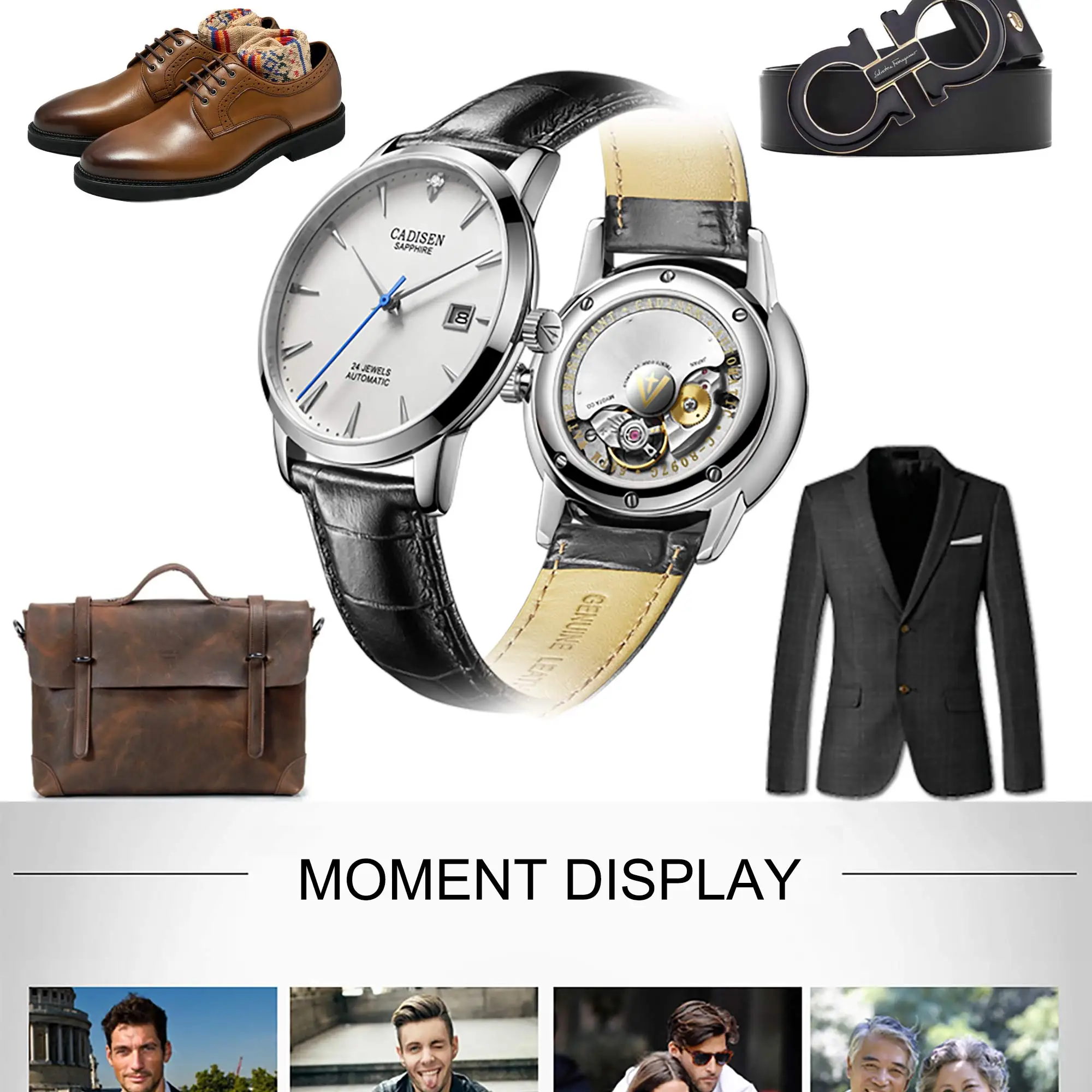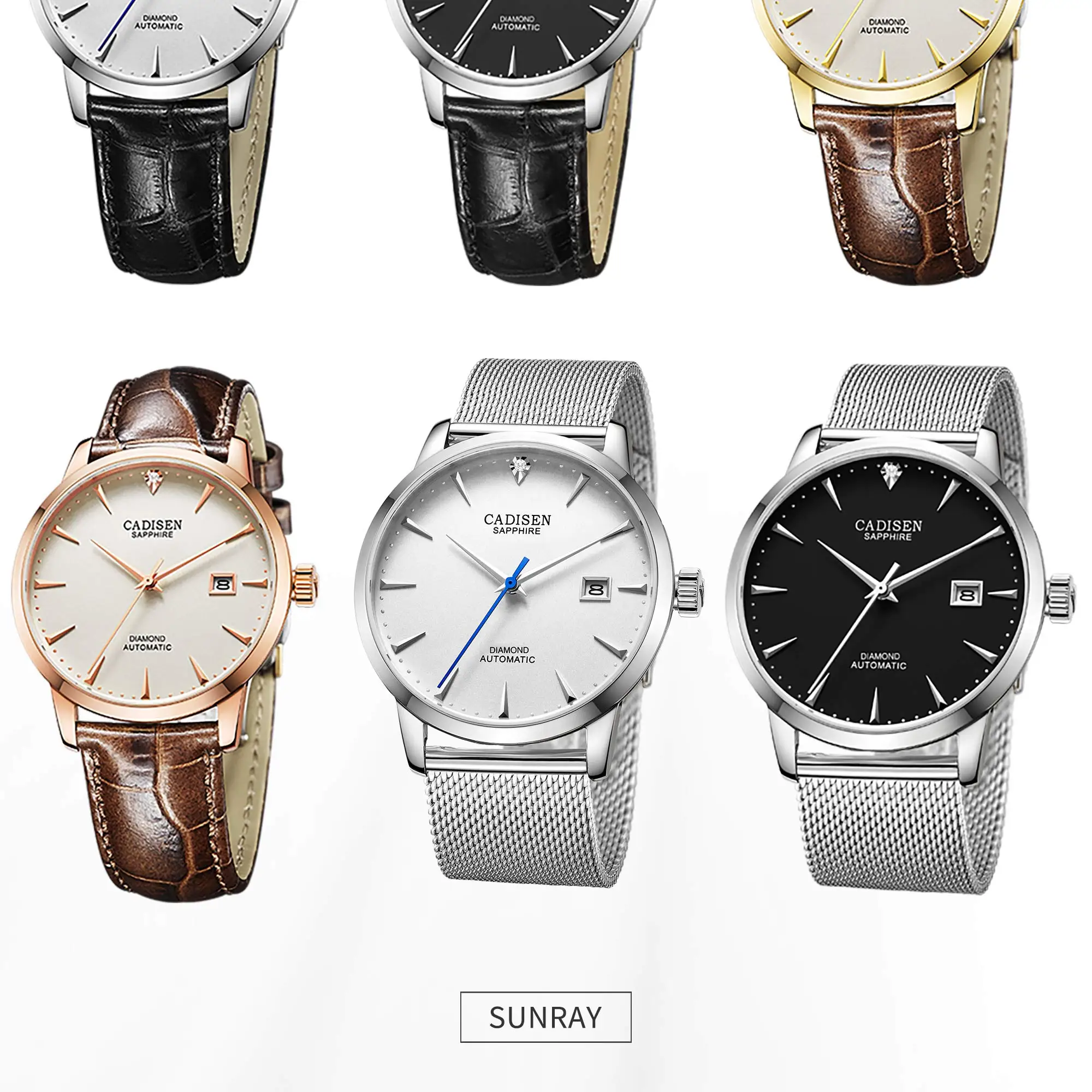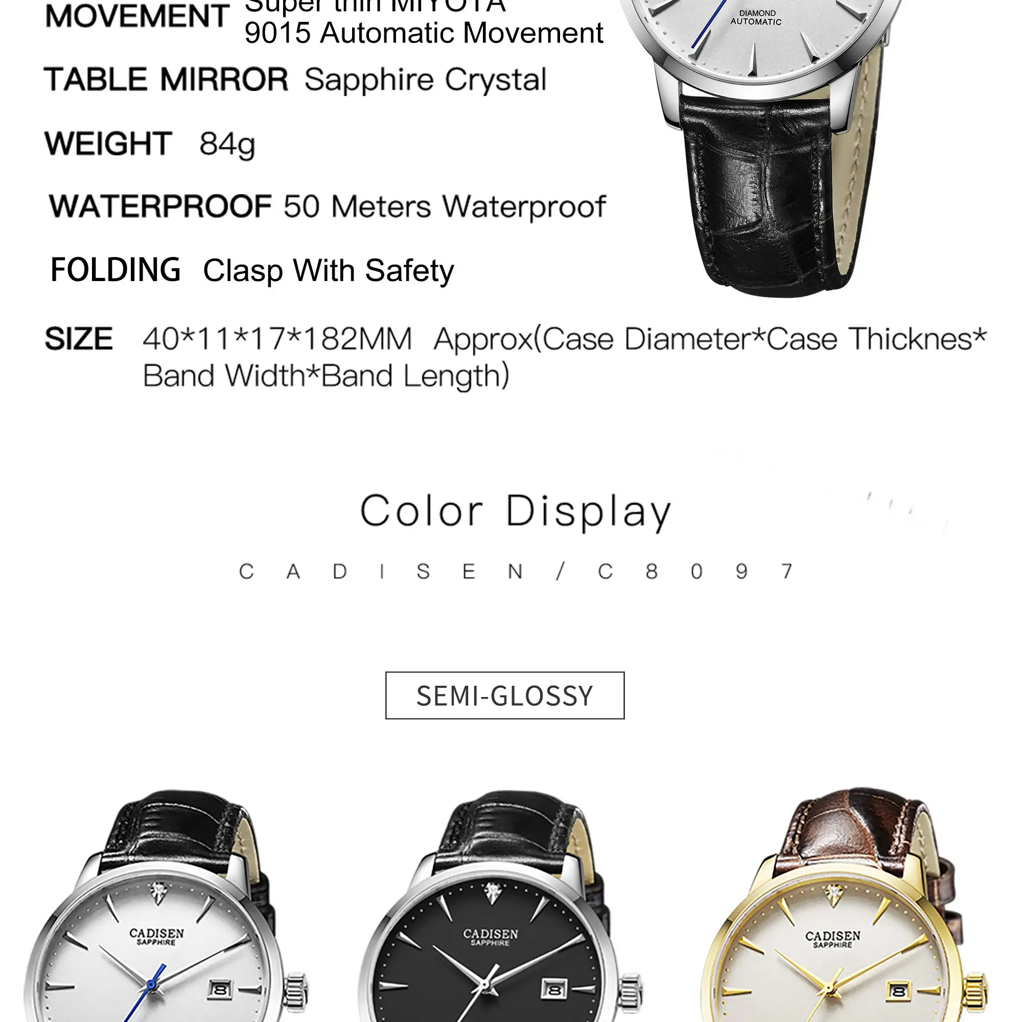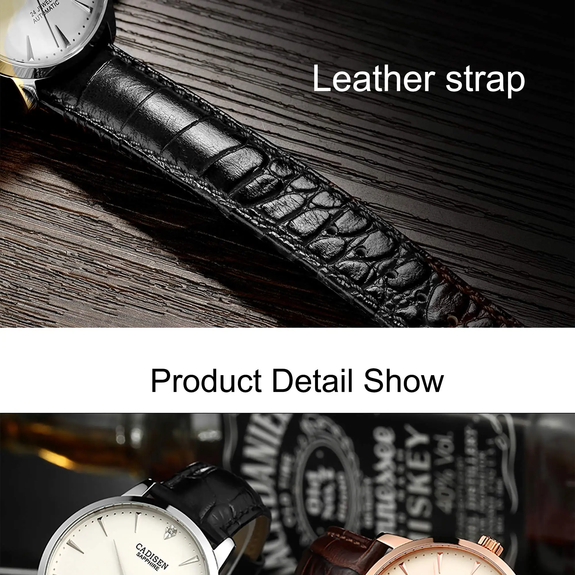 CADISEN Men Watches Automatic Mechanical Wrist Watch Japen MIYOTA 9015 Movement Hot Brand Luxury South Africa Real Diamonds Watch Stainless steel Watch Curved Sapphire Glass Genuine Leather Strap Famous Male Clock