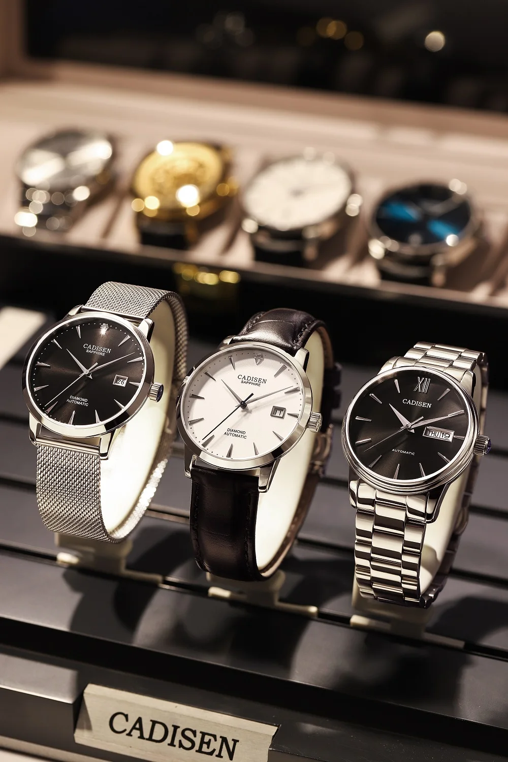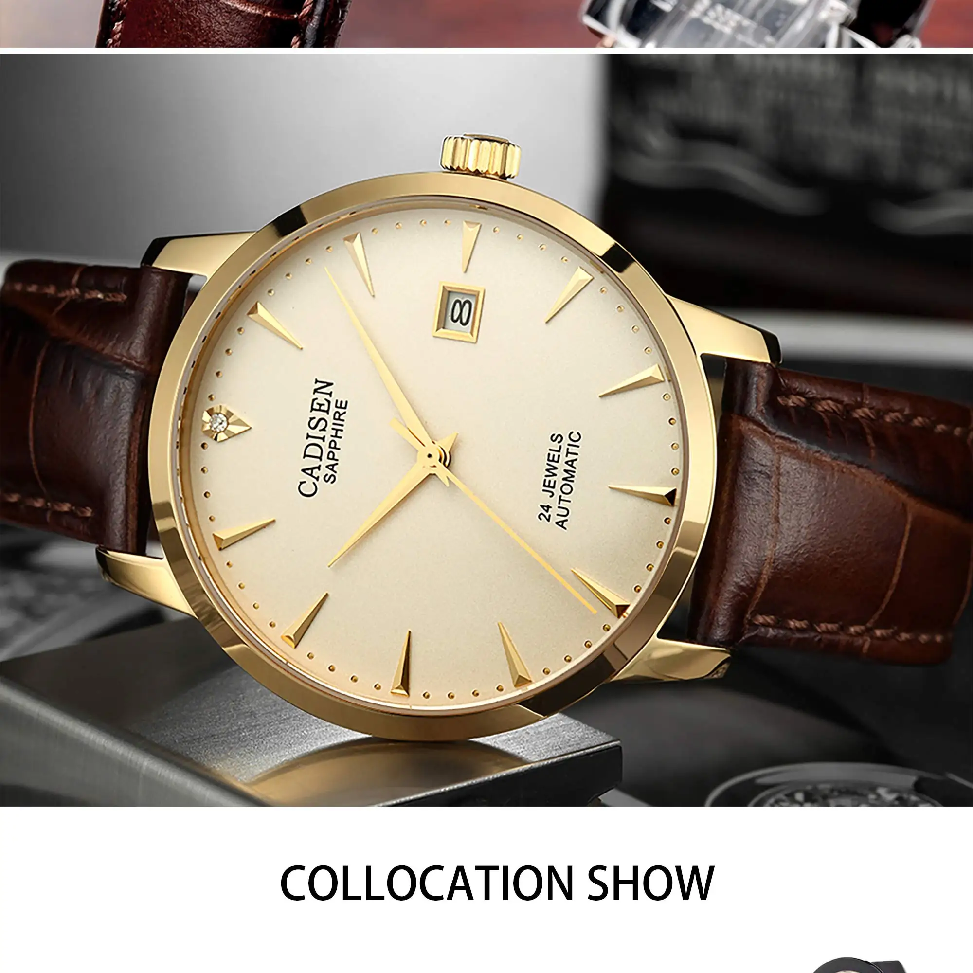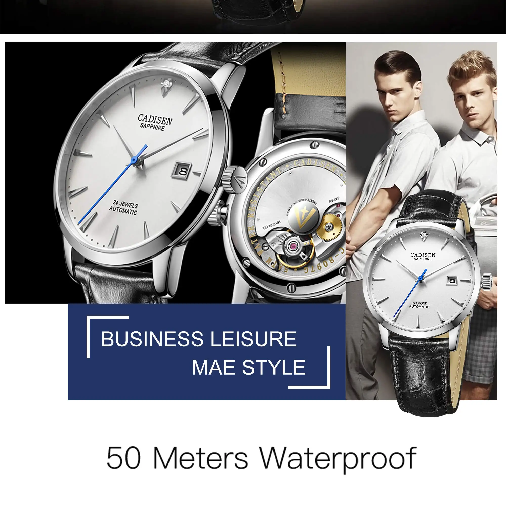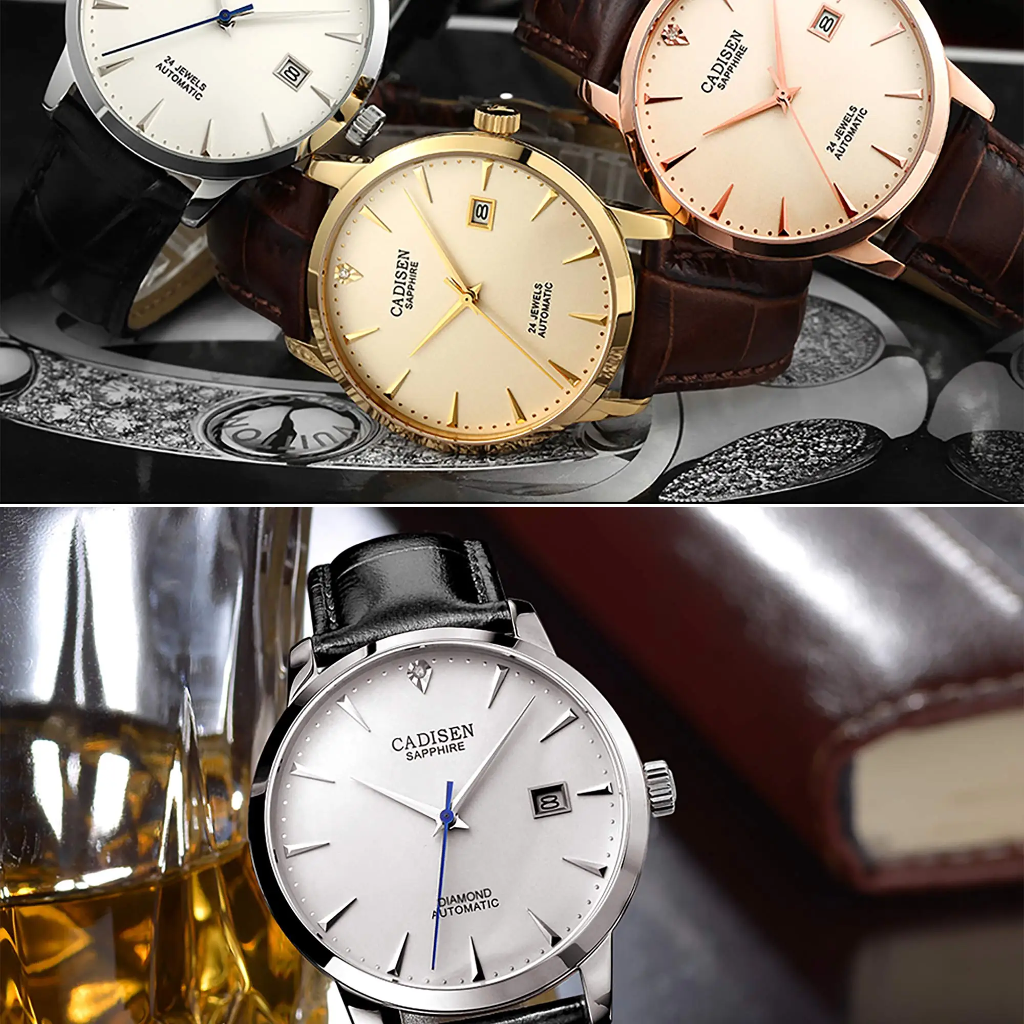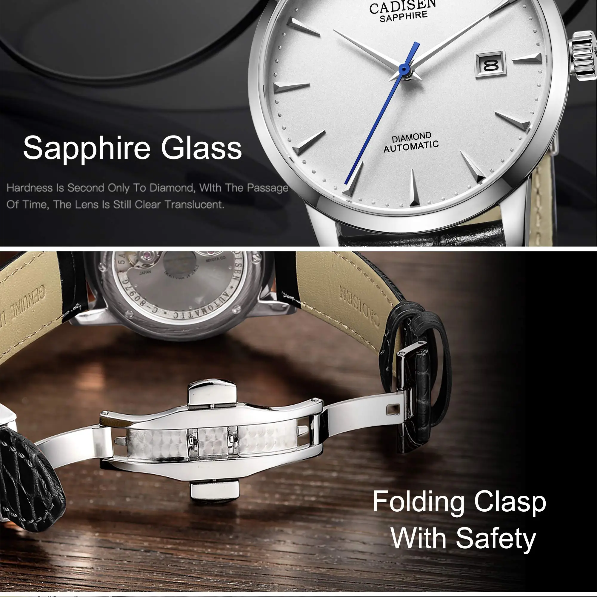 CADISEN Men Watches Automatic Mechanical Wrist Watch Japen MIYOTA 9015 Movement Hot Brand Luxury South Africa Real Diamonds Watch Stainless steel Watch Curved Sapphire Glass Genuine Leather Strap Famous Male Clock