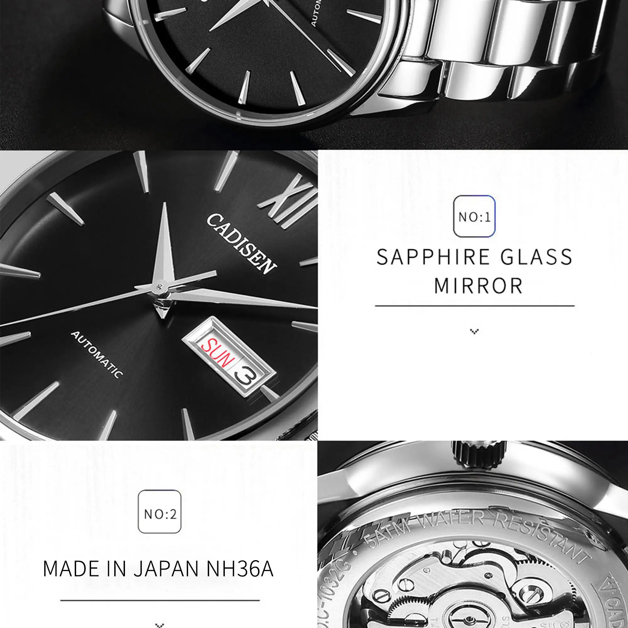 CADISEN Watch Men NH36A Mechanical movement Set Automatic Self-wind Stainless Steel Sapphire 5ATM Waterproof Business Men Wrist