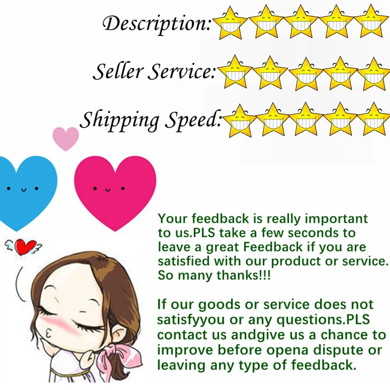 Please do contact us before leaving a Neutral or Negative feedback. As a serious and responsible seller, we will try our best to solve your problem. Your comment is very important in our business success. If you are satisfied with your purchase and our service, please take a minute to leave us a positive feedback with an overall Detailed Selling Rating (DSR) of 5.