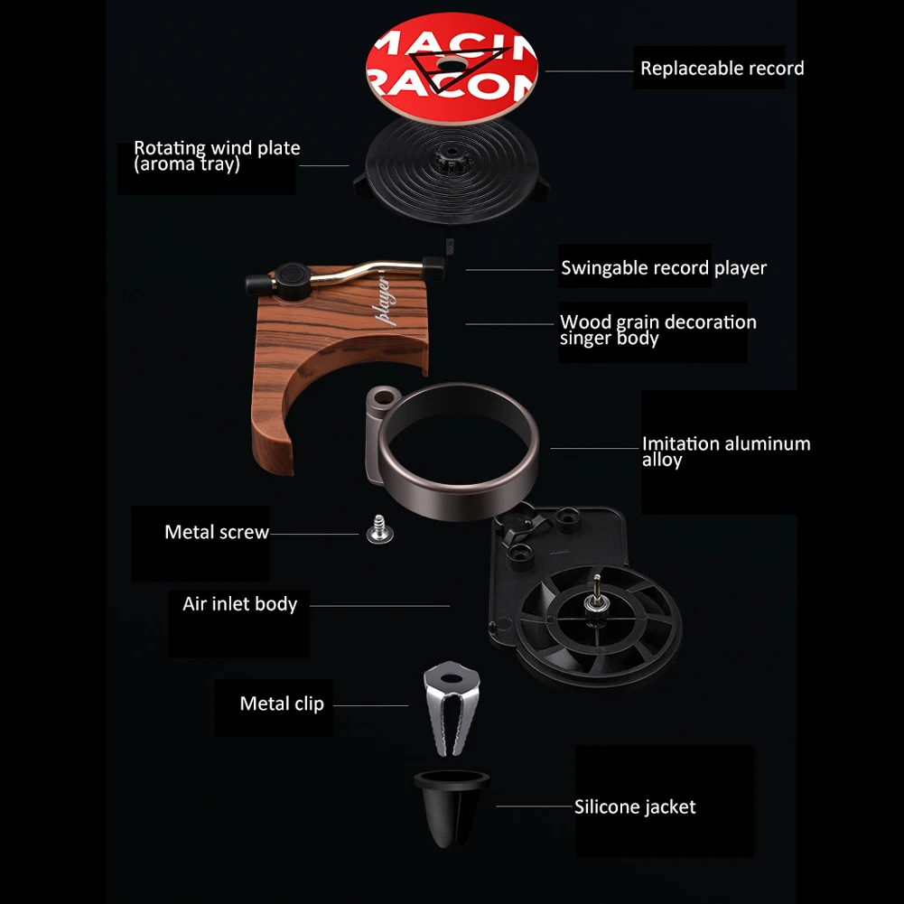 *4.The aromatherapy clip of the record player is only 2.2 × 2.1 × 1.6 inches (5.6 × 5.5 × 4 cm), small and cute. Weighing only 0.7 ounces (22 grams), the non-slip soft clip will not damage your car.