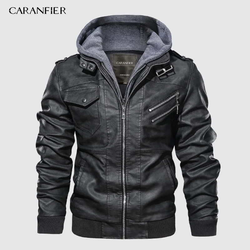 CARANFIER Mens PU Hooded Jackets Coats Motorcycle Biker Faux Leather Jacket Men Classic Winter Jackets Clothes European Size