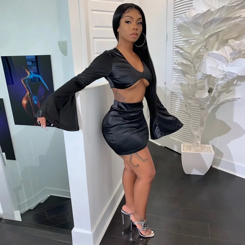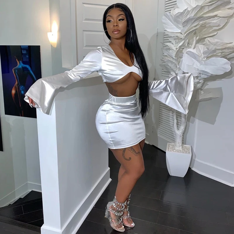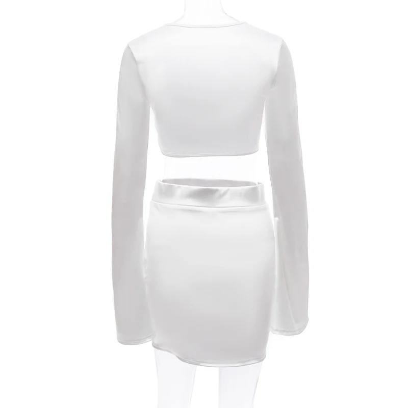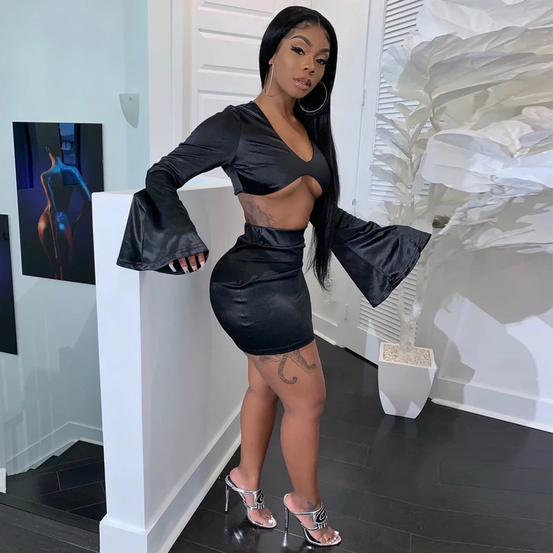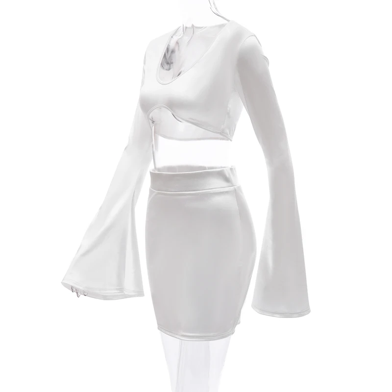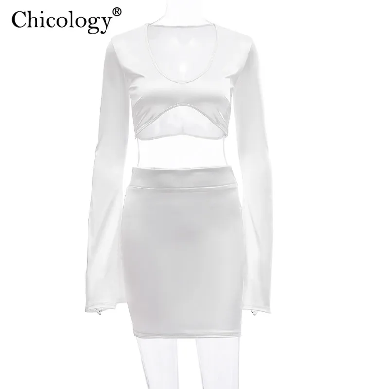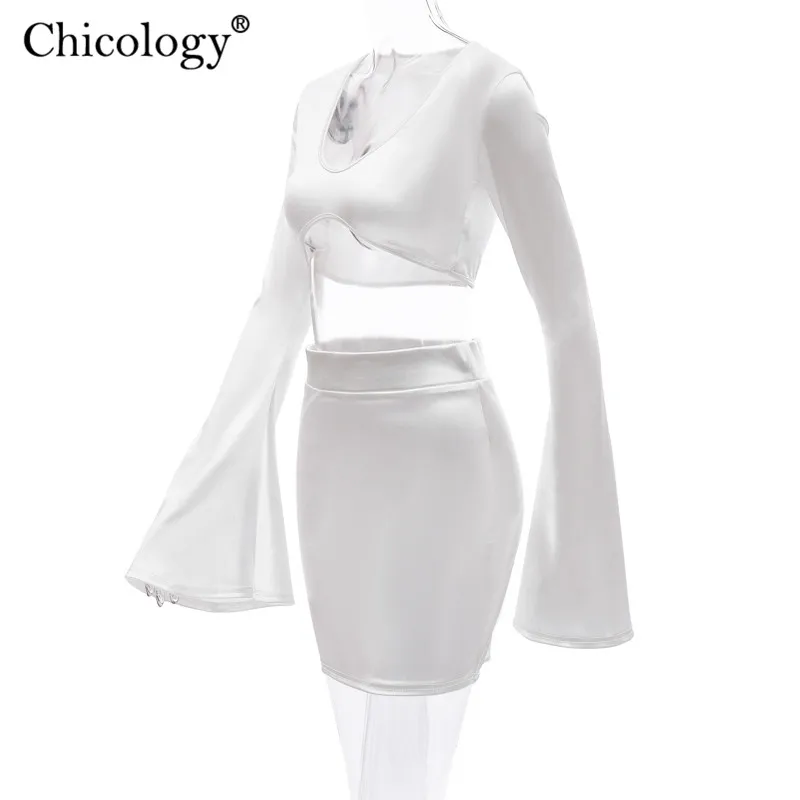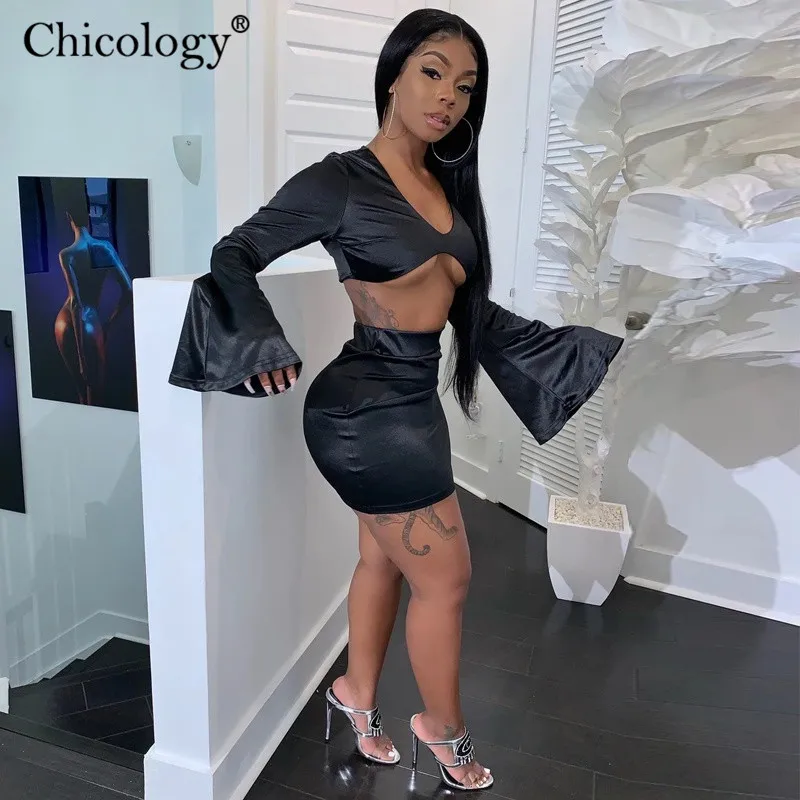 Chicology satin flare long sleeve 2 two piece matching set women crop top high waist mini skirt party clothes