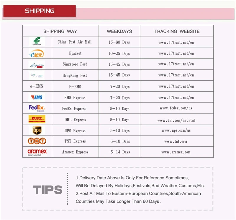 Packages from our warehouse in China will be shipped by ePacket or EMS depending on the weight and size of the product. Packages shipped from our US warehouse are shipped through USPS.