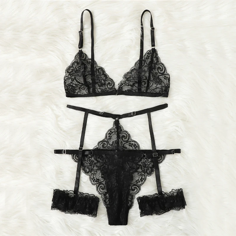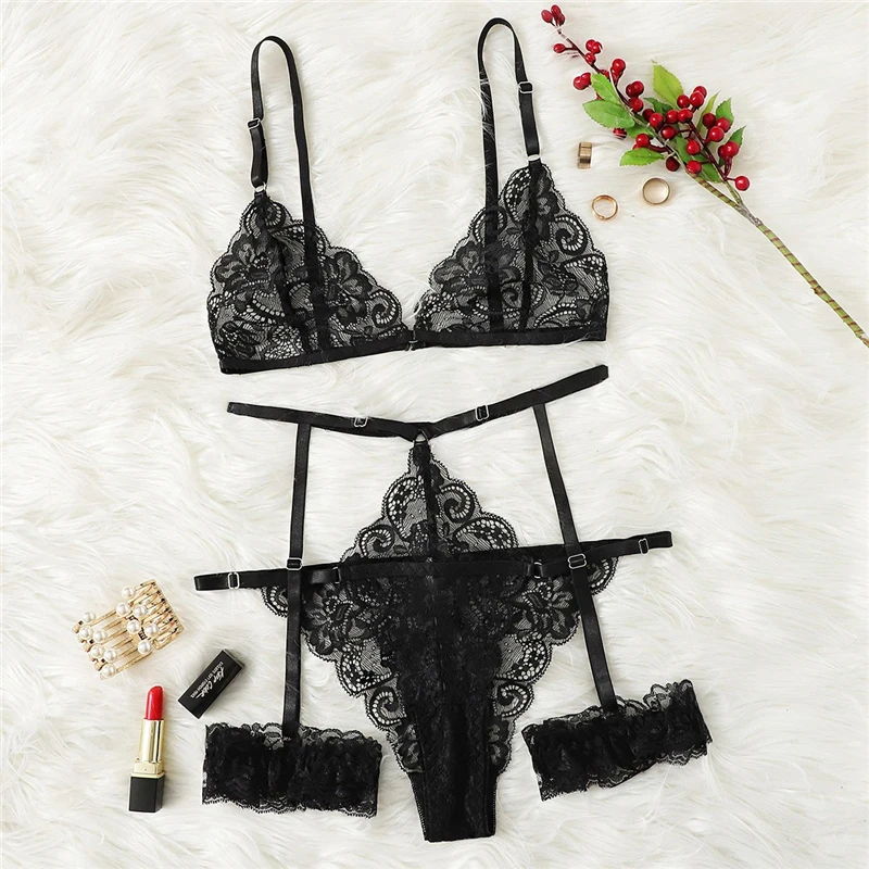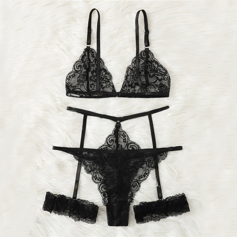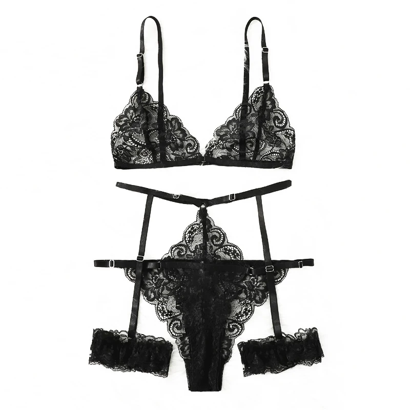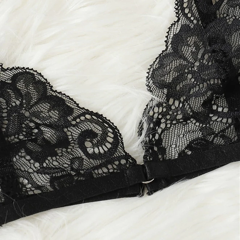 COLROVIE Black Scalloped Trim Floral Garter Women Lace Lingerie Set Sexy Femme Intimates Transparent Underwear Bra Set
