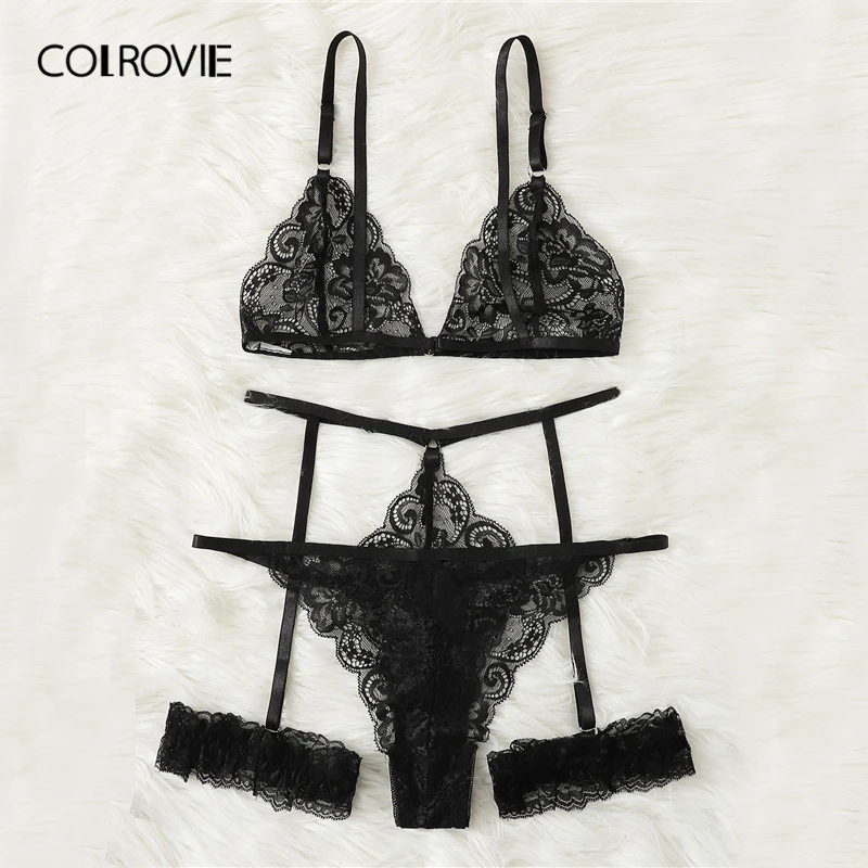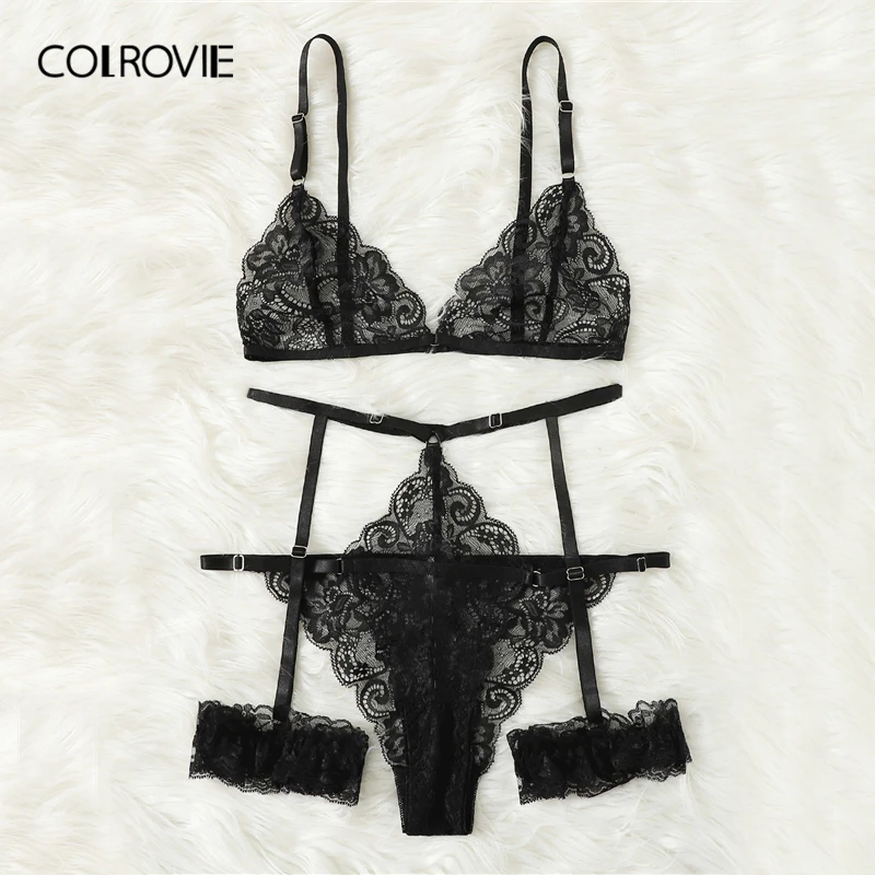 COLROVIE Black Scalloped Trim Floral Garter Women Lace Lingerie Set Sexy Femme Intimates Transparent Underwear Bra Set