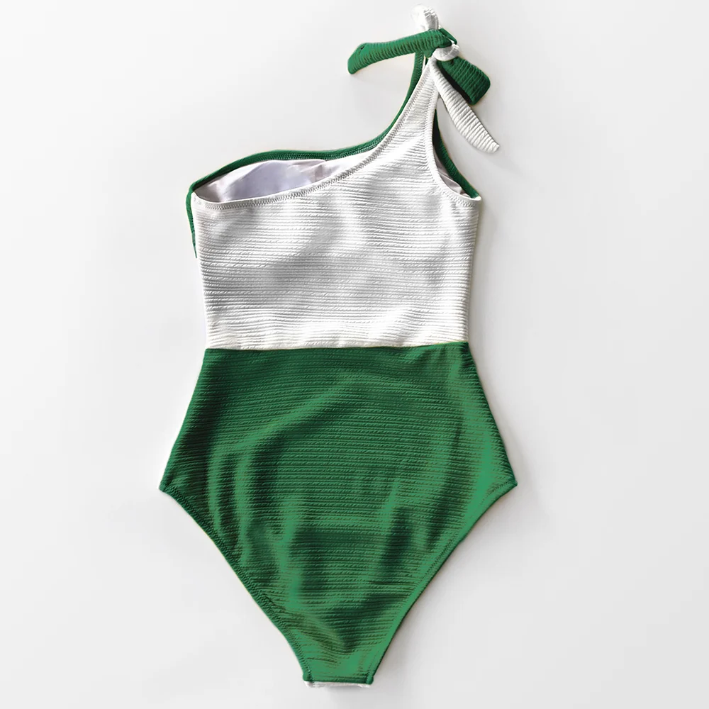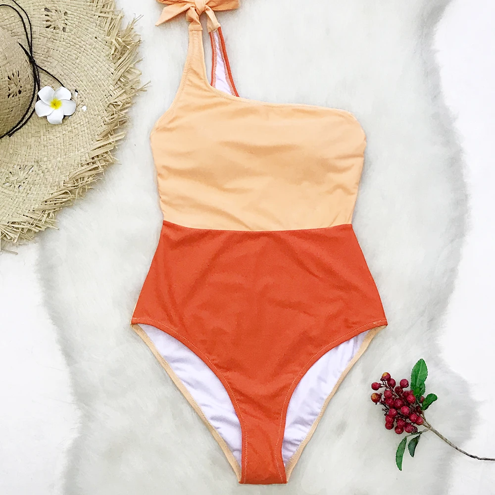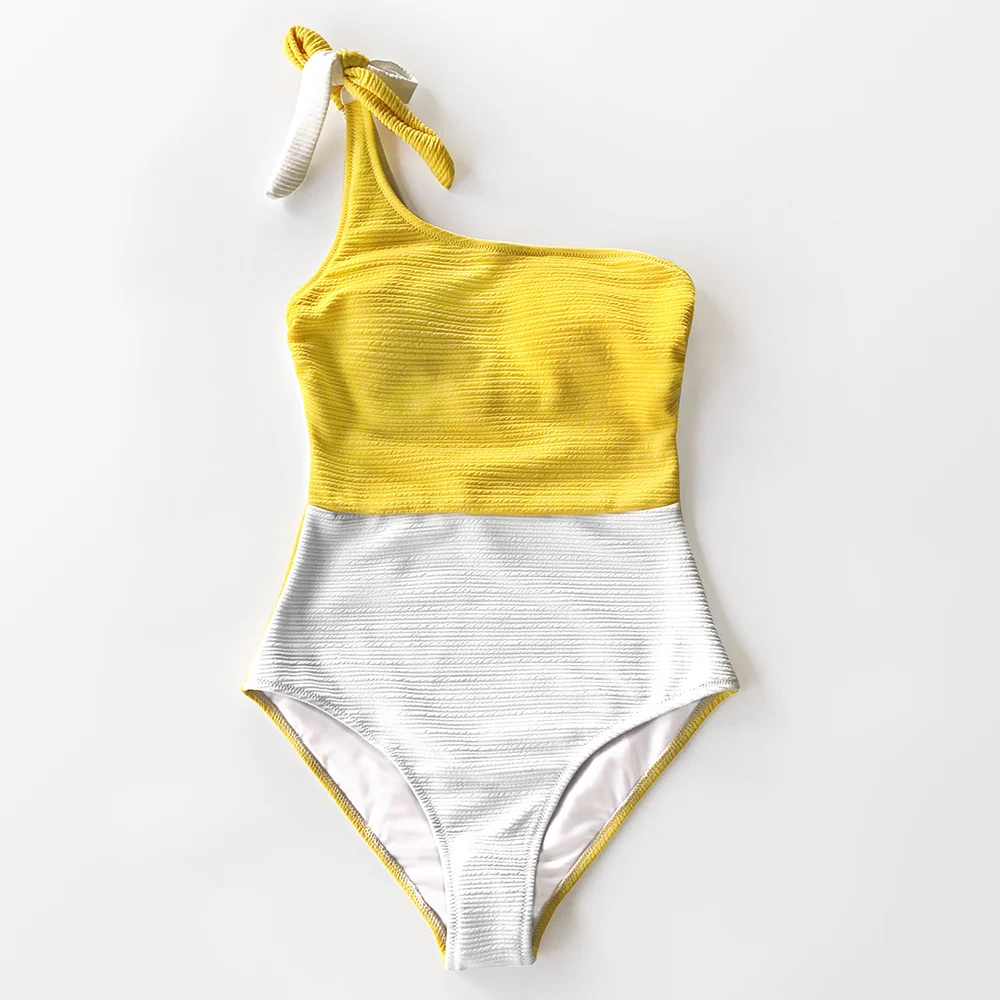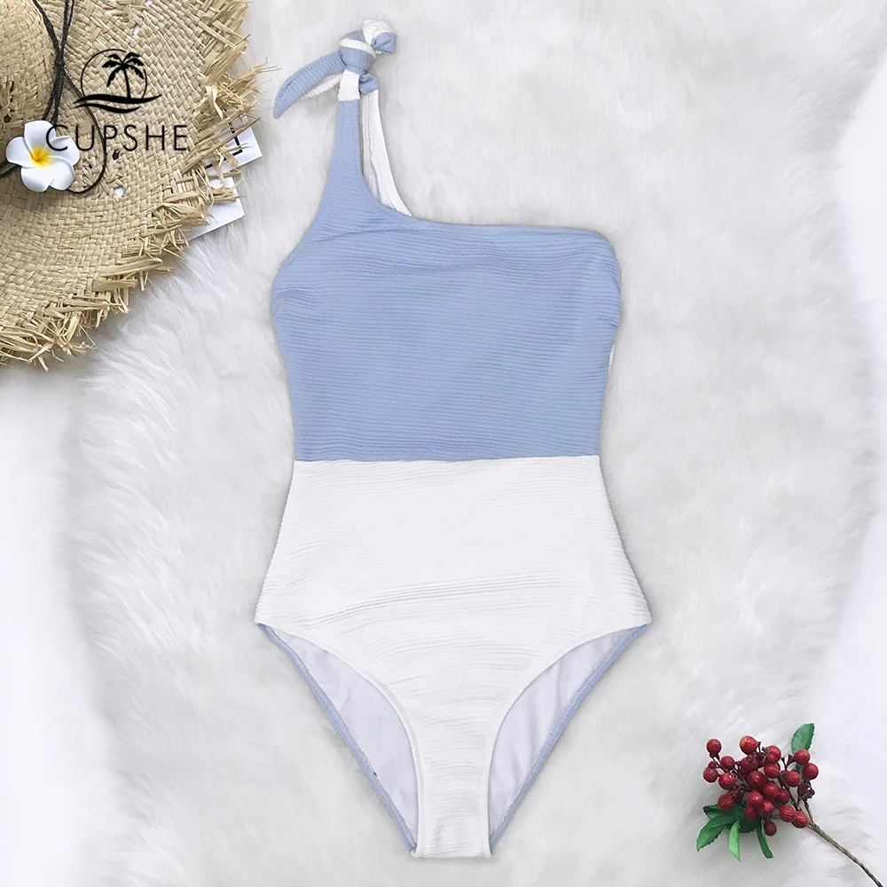 CUPSHE Blue And White Colorblock One Shoulder One-Piece Swimsuit 2020 Women Tied Bow Monokini Swimwear