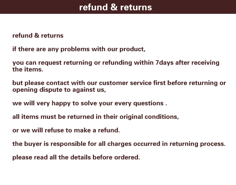 • If you do not want the product you’ve received you may request a refund but you must return the item at your expense and the item must be unused.