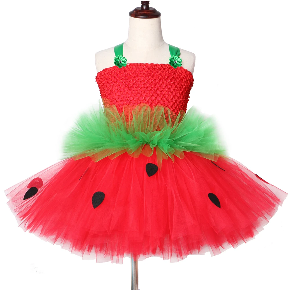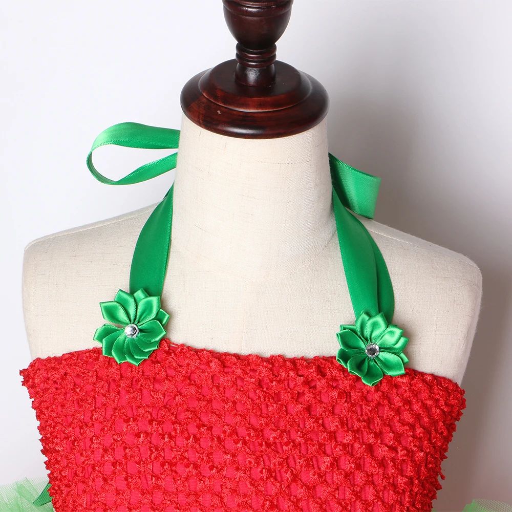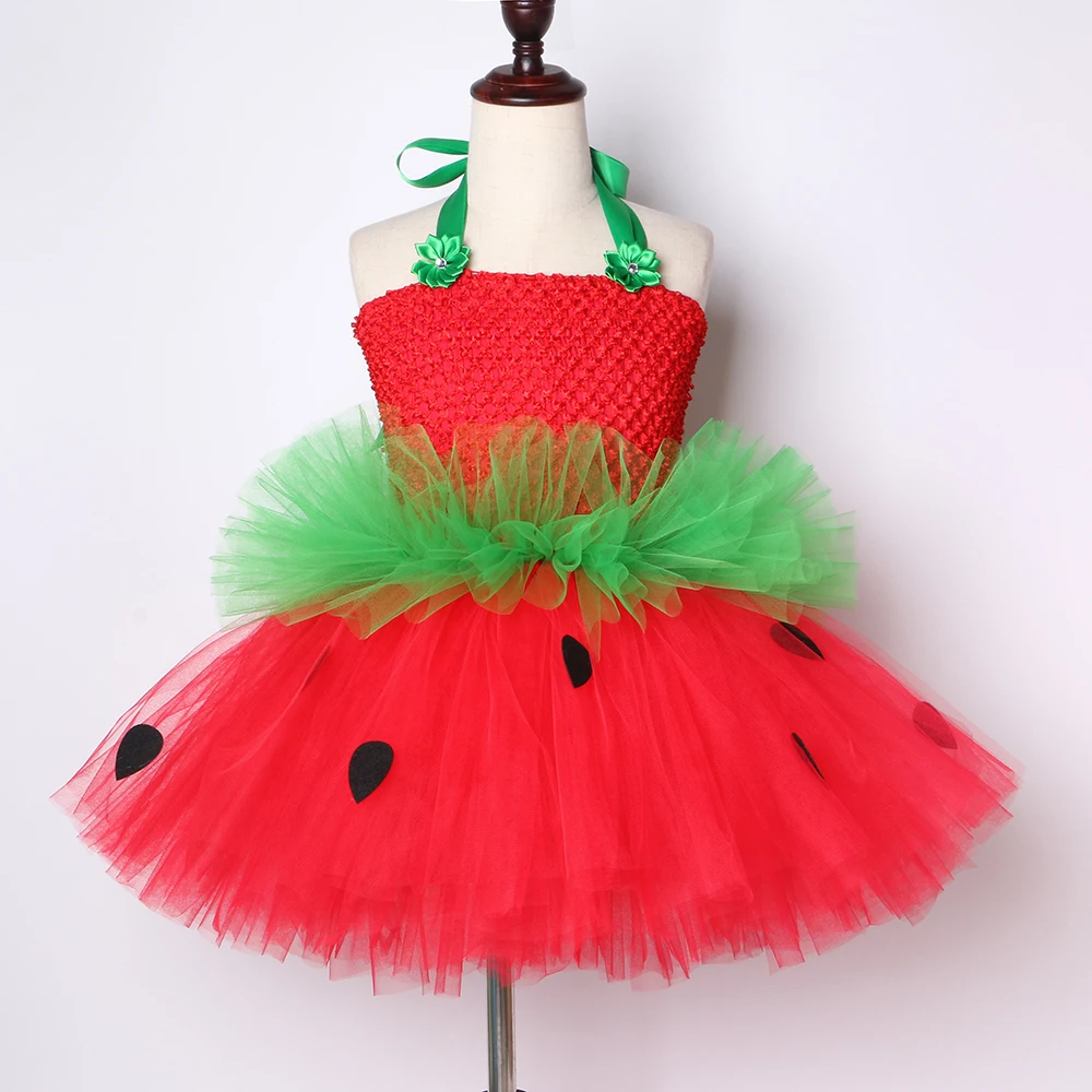 Cute Strawberry Tutu Dress Red Green Tulle Flowers Princess Girls Birthday Party Dress Children Kids Christmas Halloween Costume
