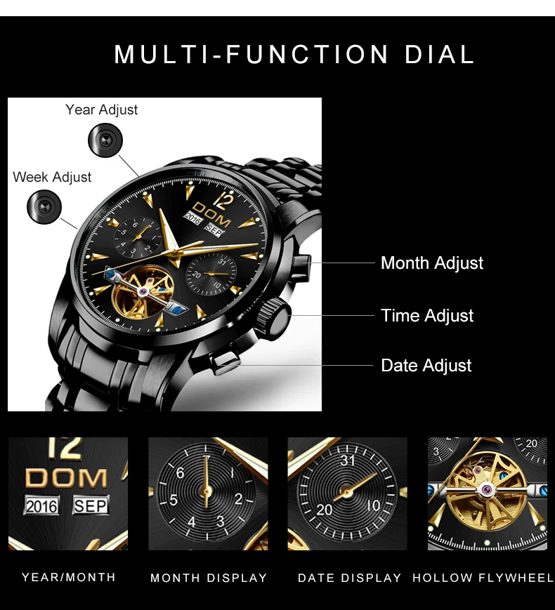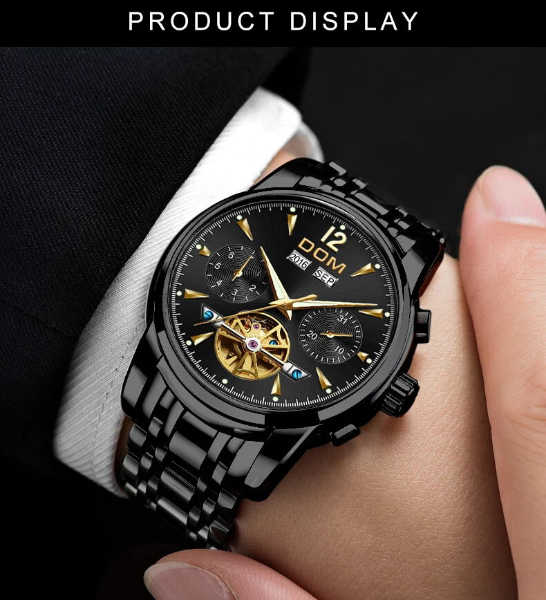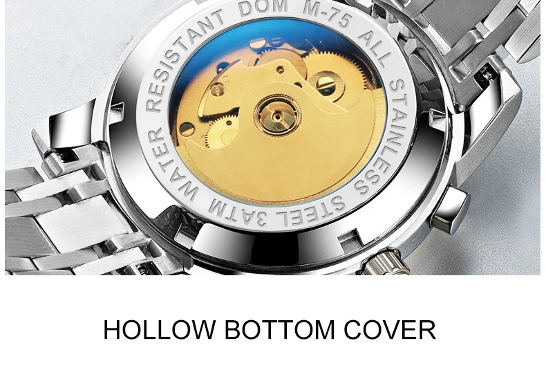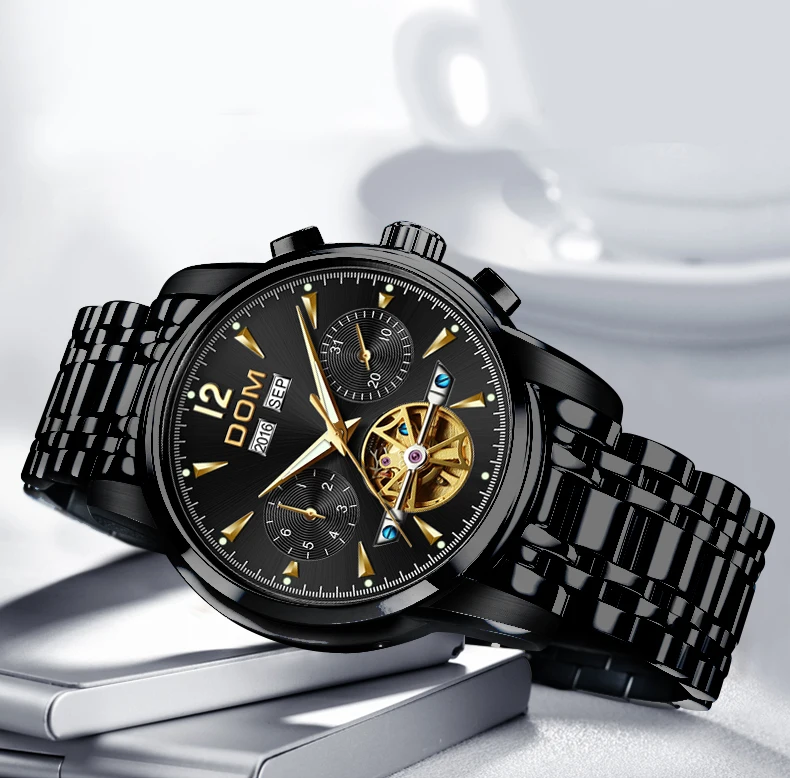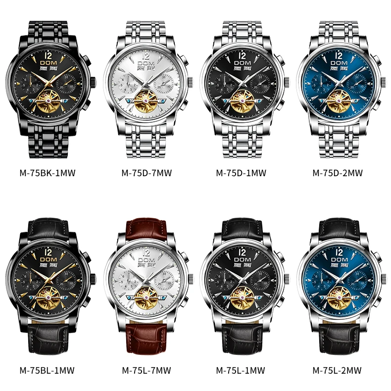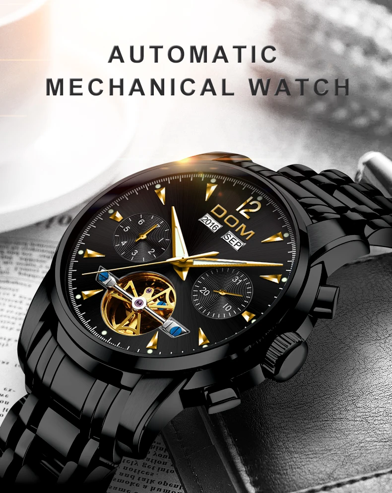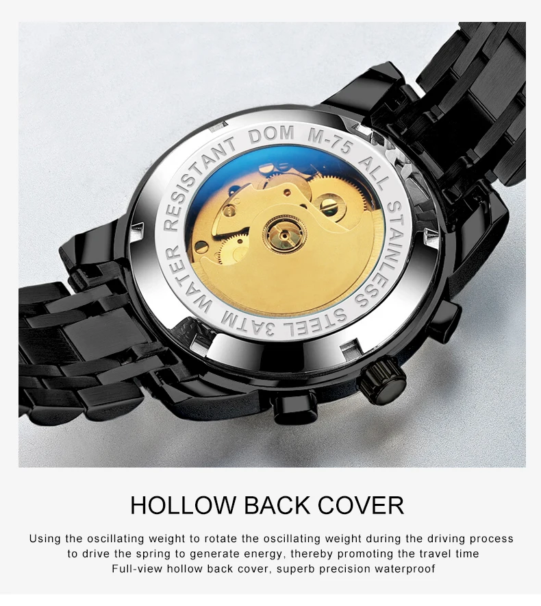 DOM Mechanical Mens Wrist Watches Automatic Retro Watch Men Waterproof Black Full-Steel Watch Clock Montre Homme M-75BK-1MW