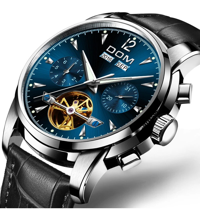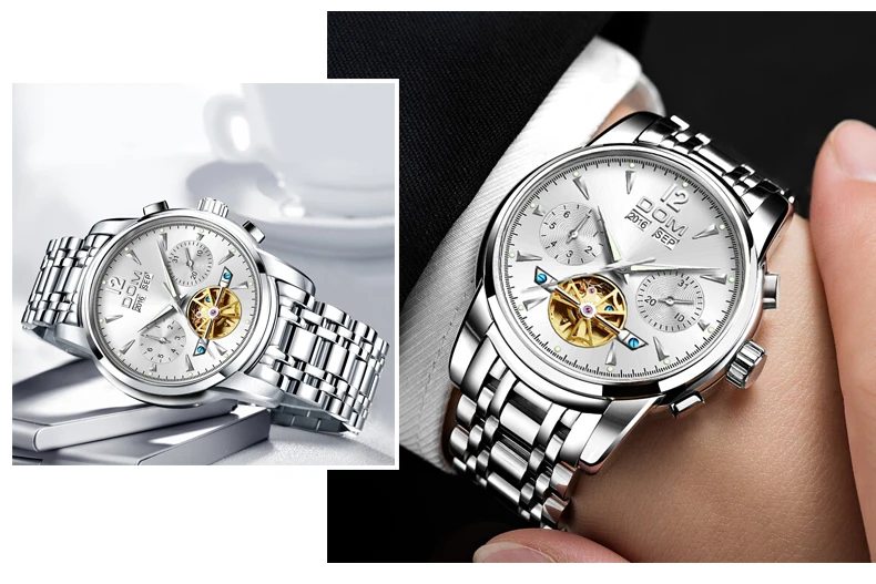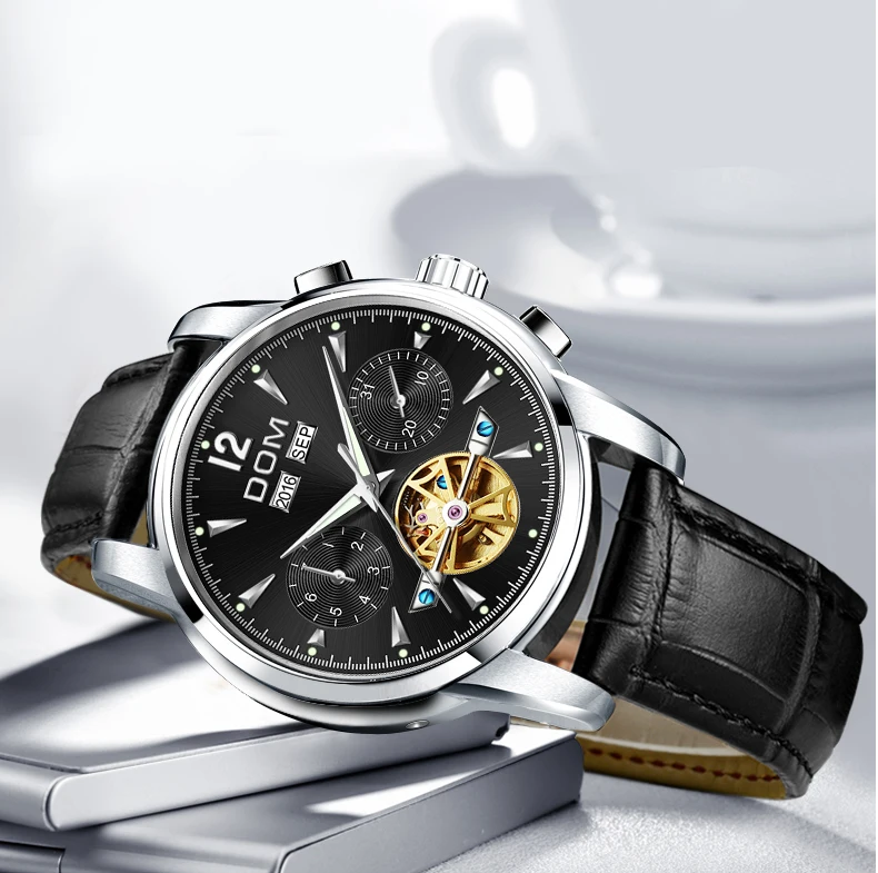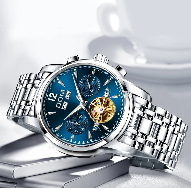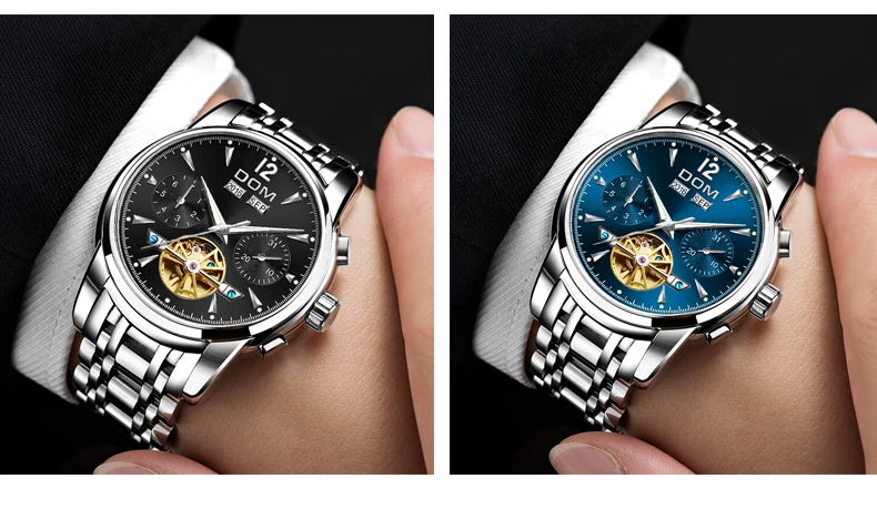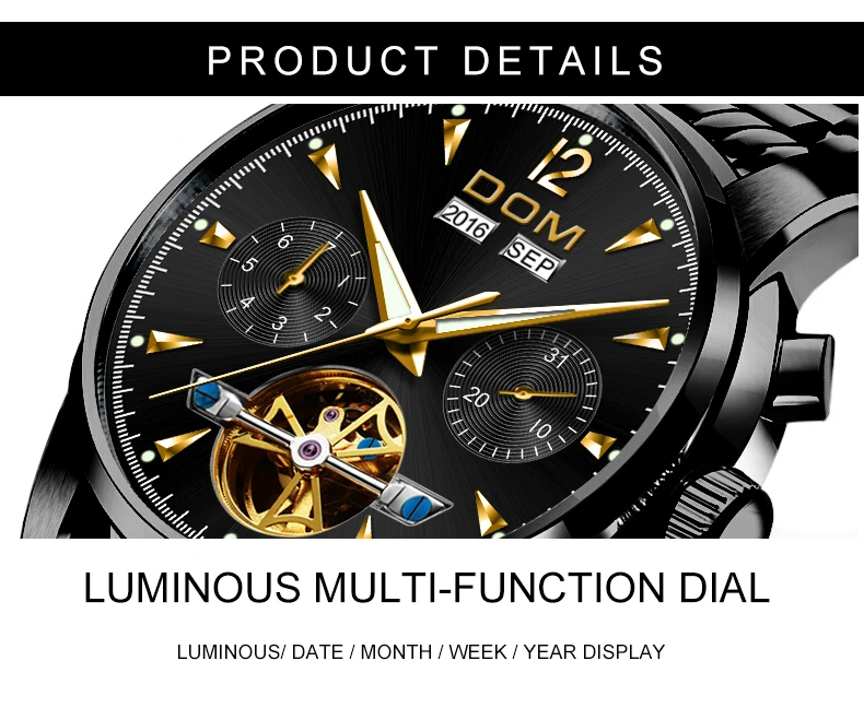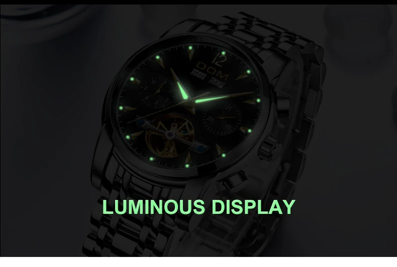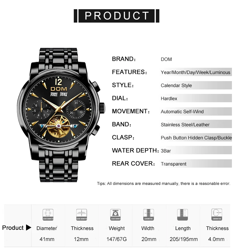 DOM Mechanical Mens Wrist Watches Automatic Retro Watch Men Waterproof Black Full-Steel Watch Clock Montre Homme M-75BK-1MW