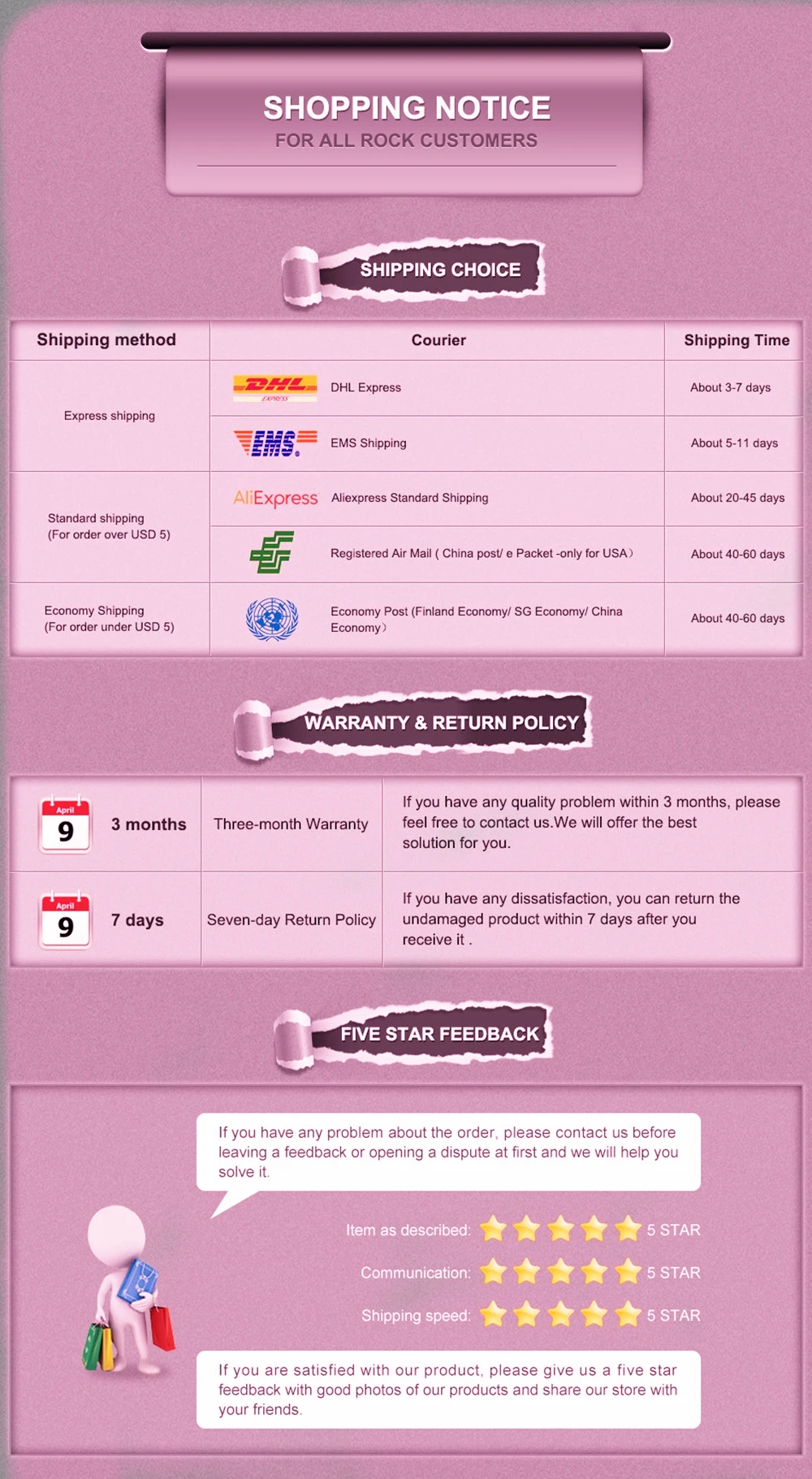 • If you did not receive the product within the guaranteed time( 45 days not including 2-5 day processing) you can request a refund or a reshipment.