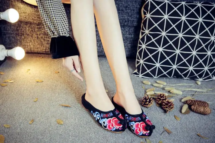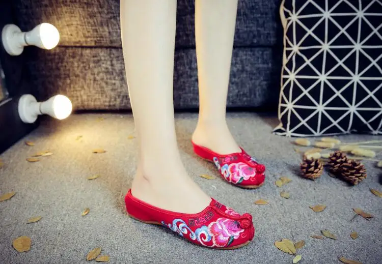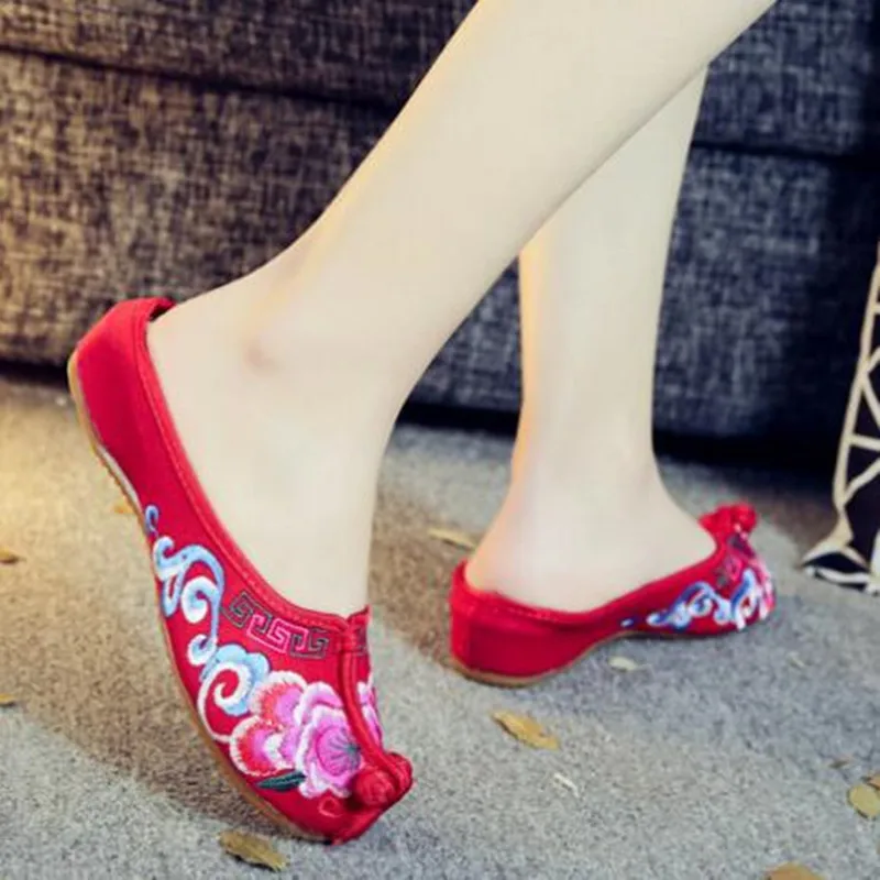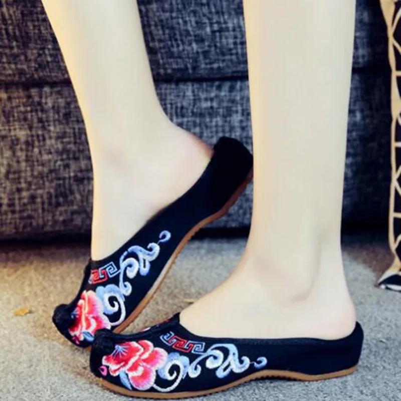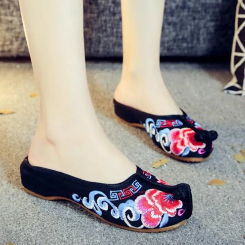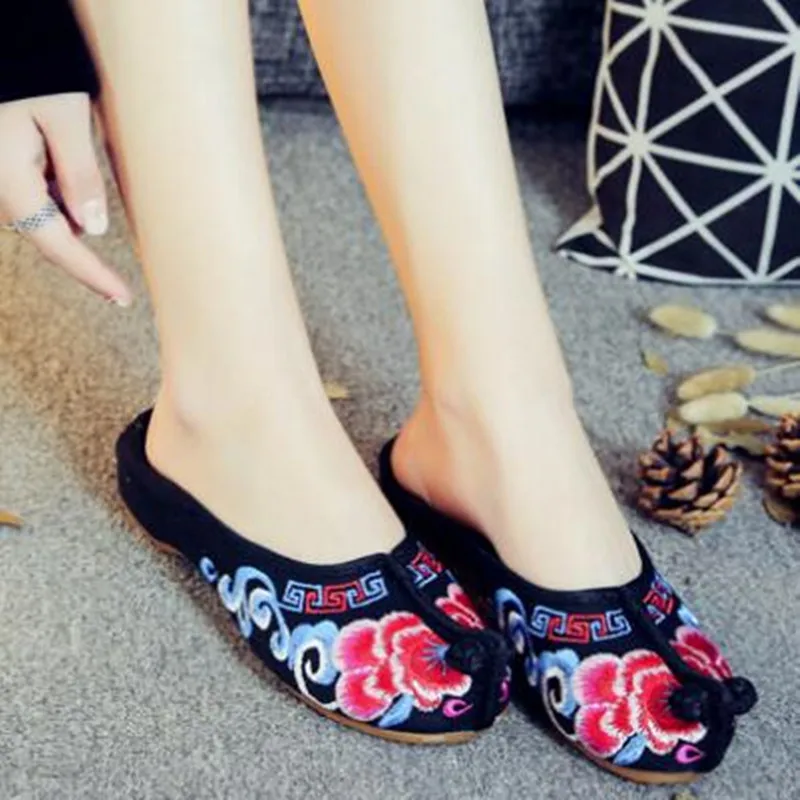 Embroidered Women Slippers Backless Flat Shoes Ladies Vintage Loafers Chinese Style Slides Beach Flip Flops Canvas Mule Shoes