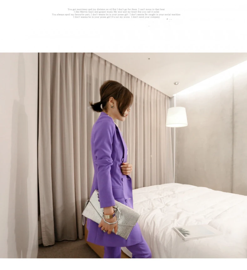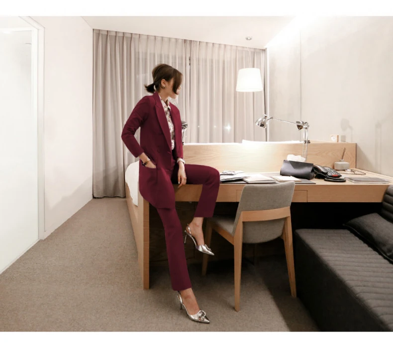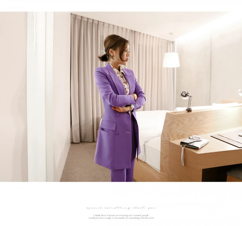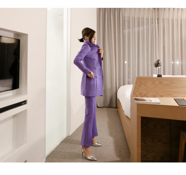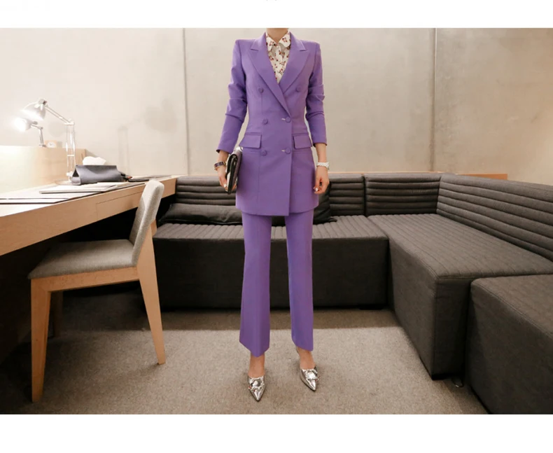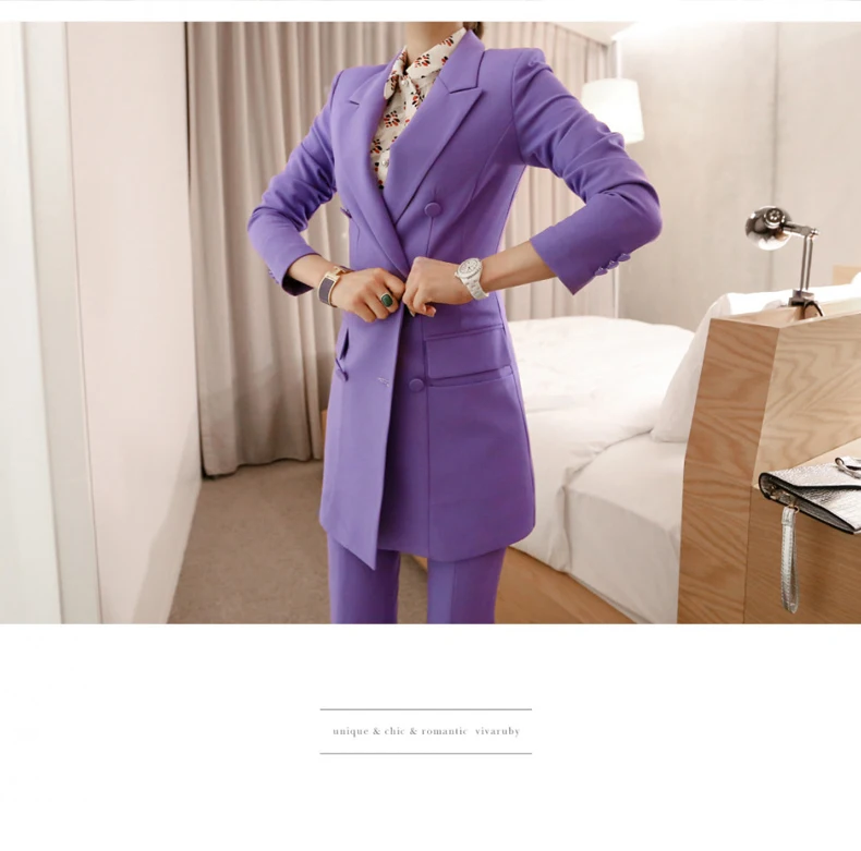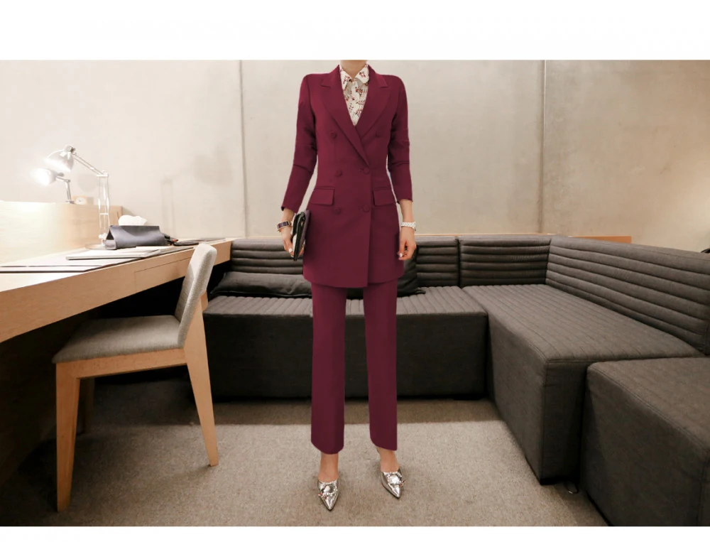 Fashion Double Breasted Women Pant Suit Notched Long Blazer Jacket And Straight Pant Casual 2 Pieces Set Slim Work Business Set