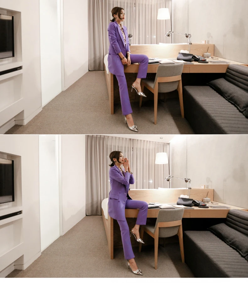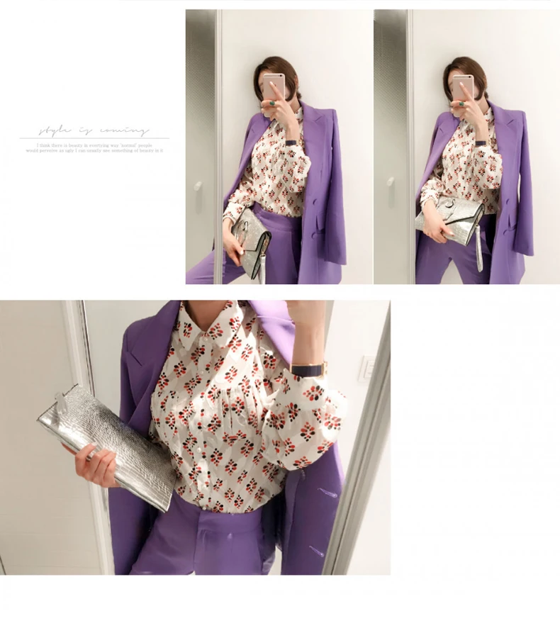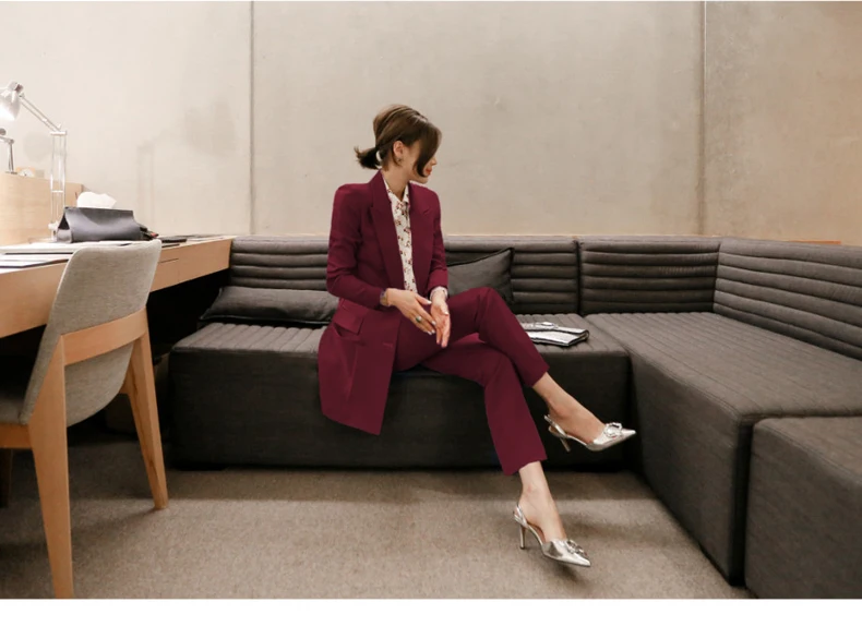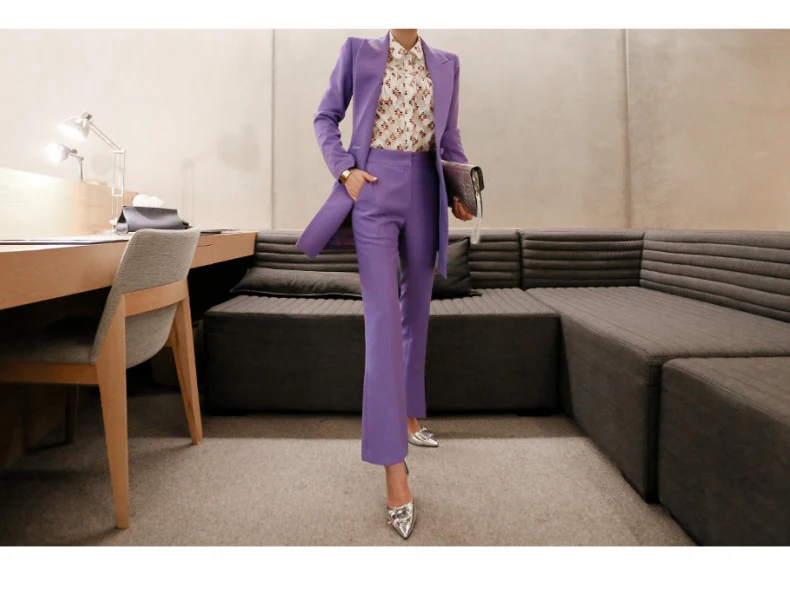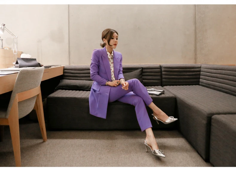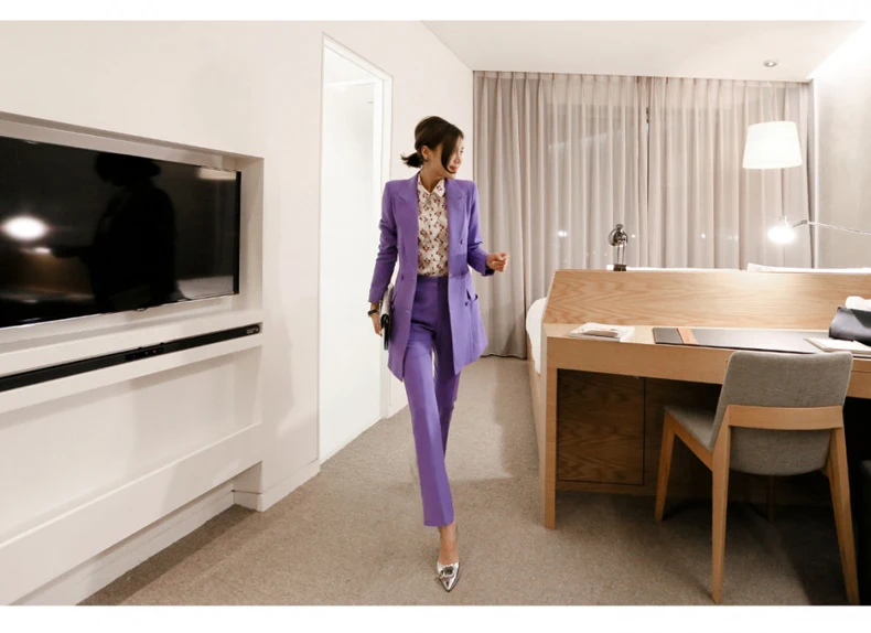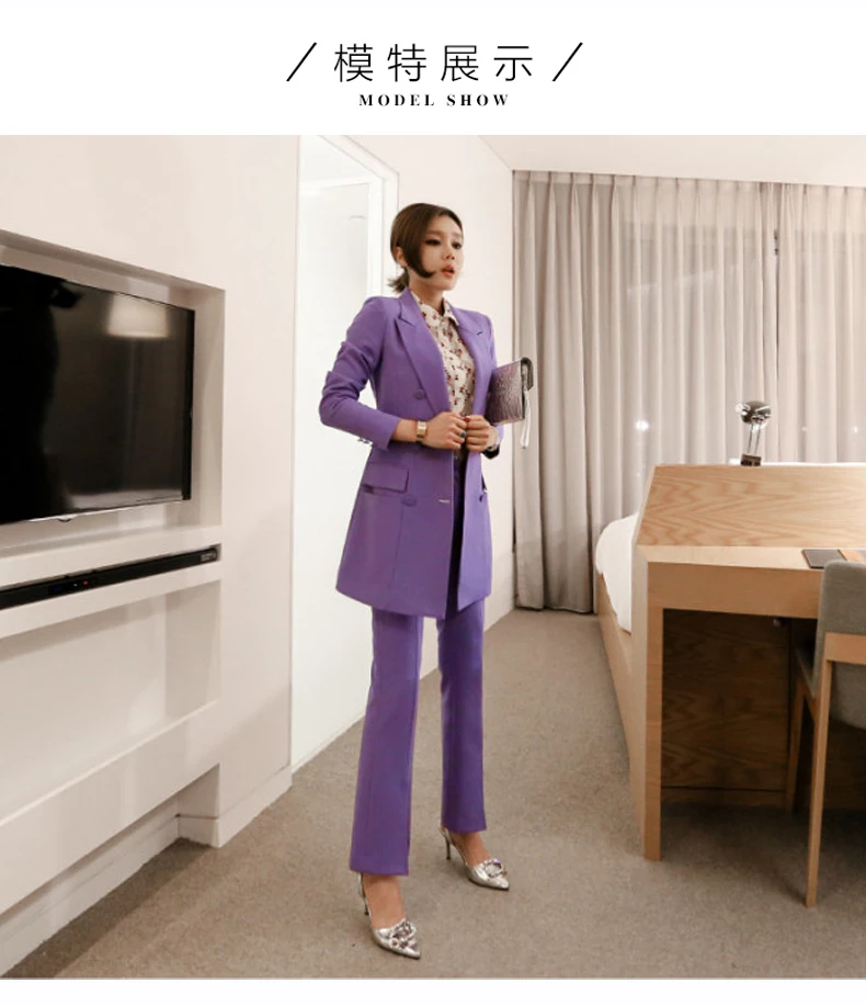 Fashion Double Breasted Women Pant Suit Notched Long Blazer Jacket And Straight Pant Casual 2 Pieces Set Slim Work Business Set