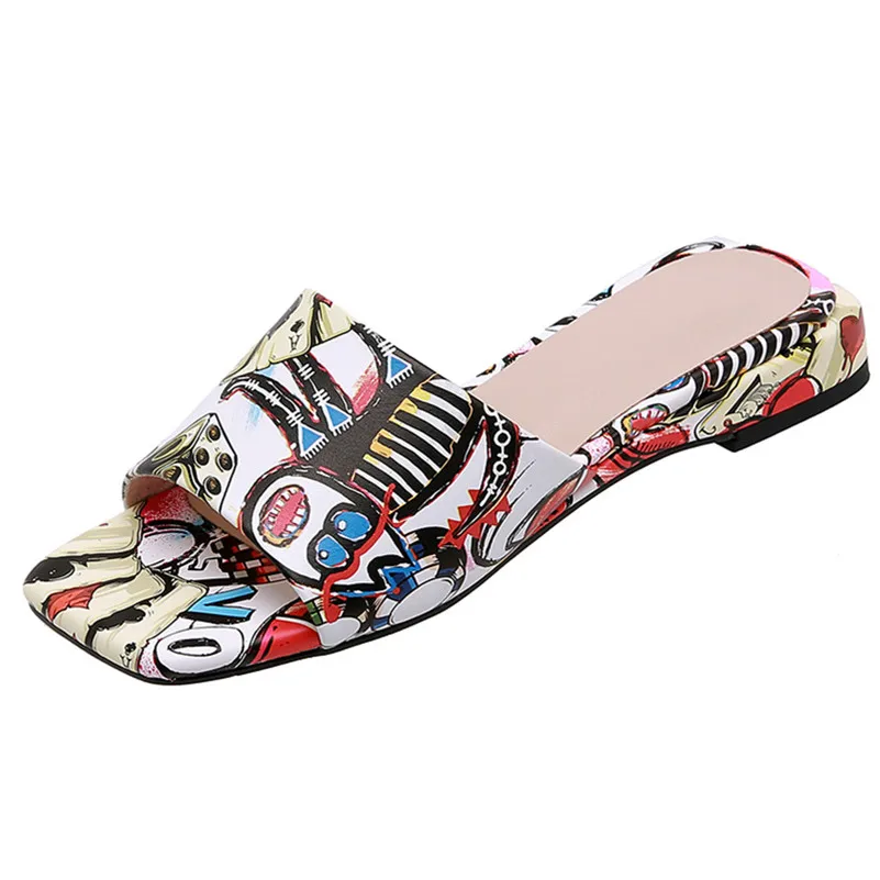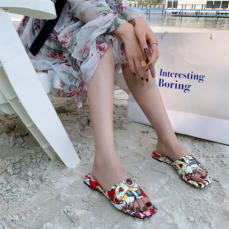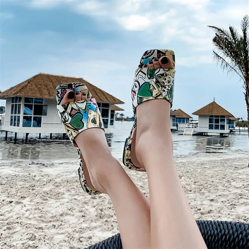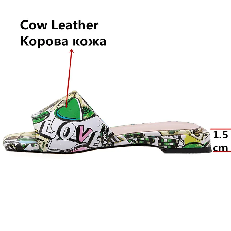 FEDONAS Summer Fashion Sweet Print Square Toe Low Heels Women Sandals Shallow Slip on Genuine Leather Casual Basic Shoes Woman