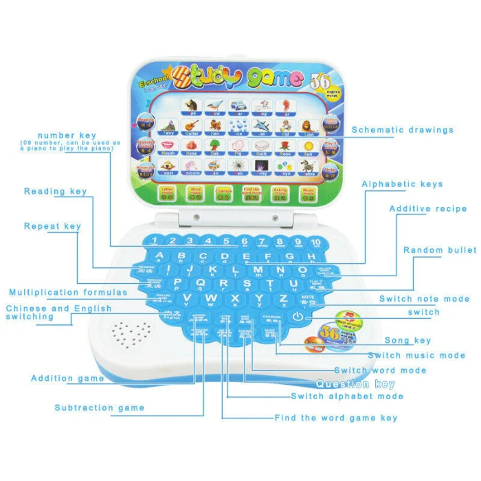 3. There are 26 English alphabet keyboards, which correspond to 32 English words and picture knowledge points on the flip cover. When the machine questions, 26 letters are controlled to answer the questions, and after switching, it becomes 26 songs.