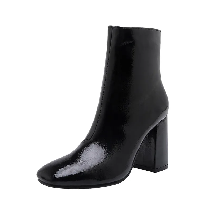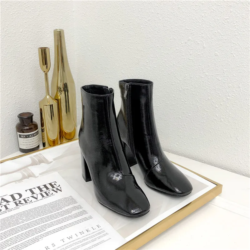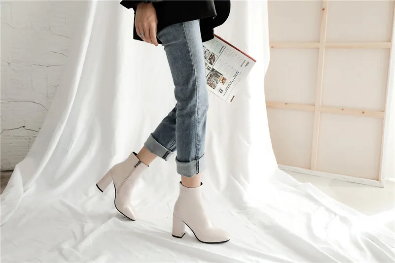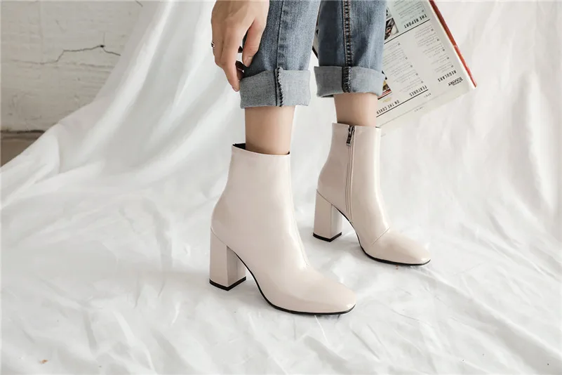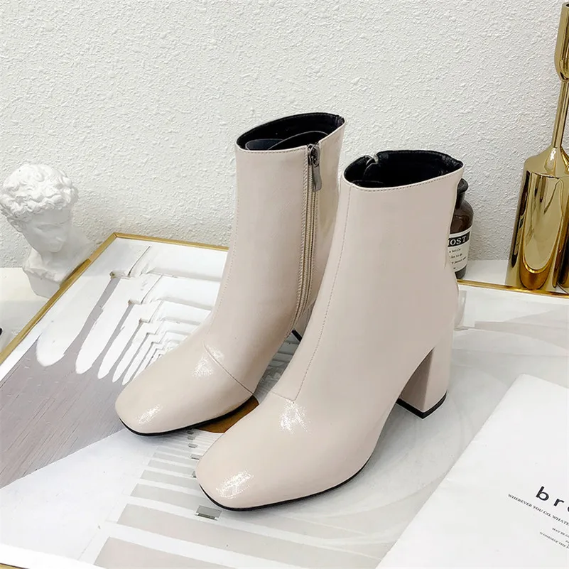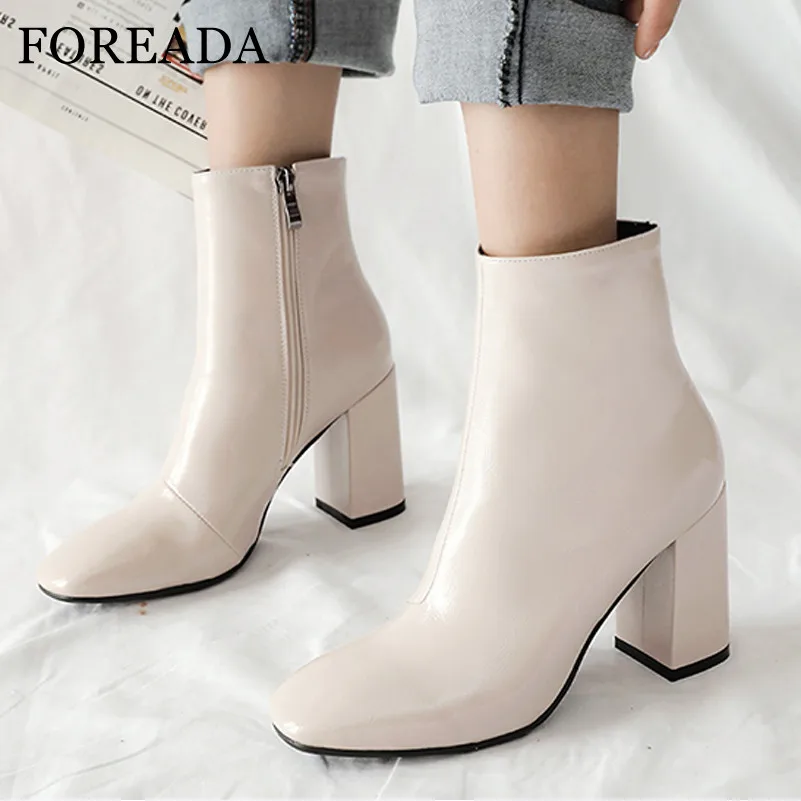 FOREADA Extreme High Heel Short Boots Woman Chunky Heel Mid Calf Boots Zip Square Toe Female Shoes Autumn Winter Black Beige 45